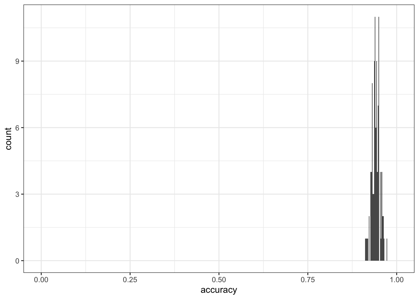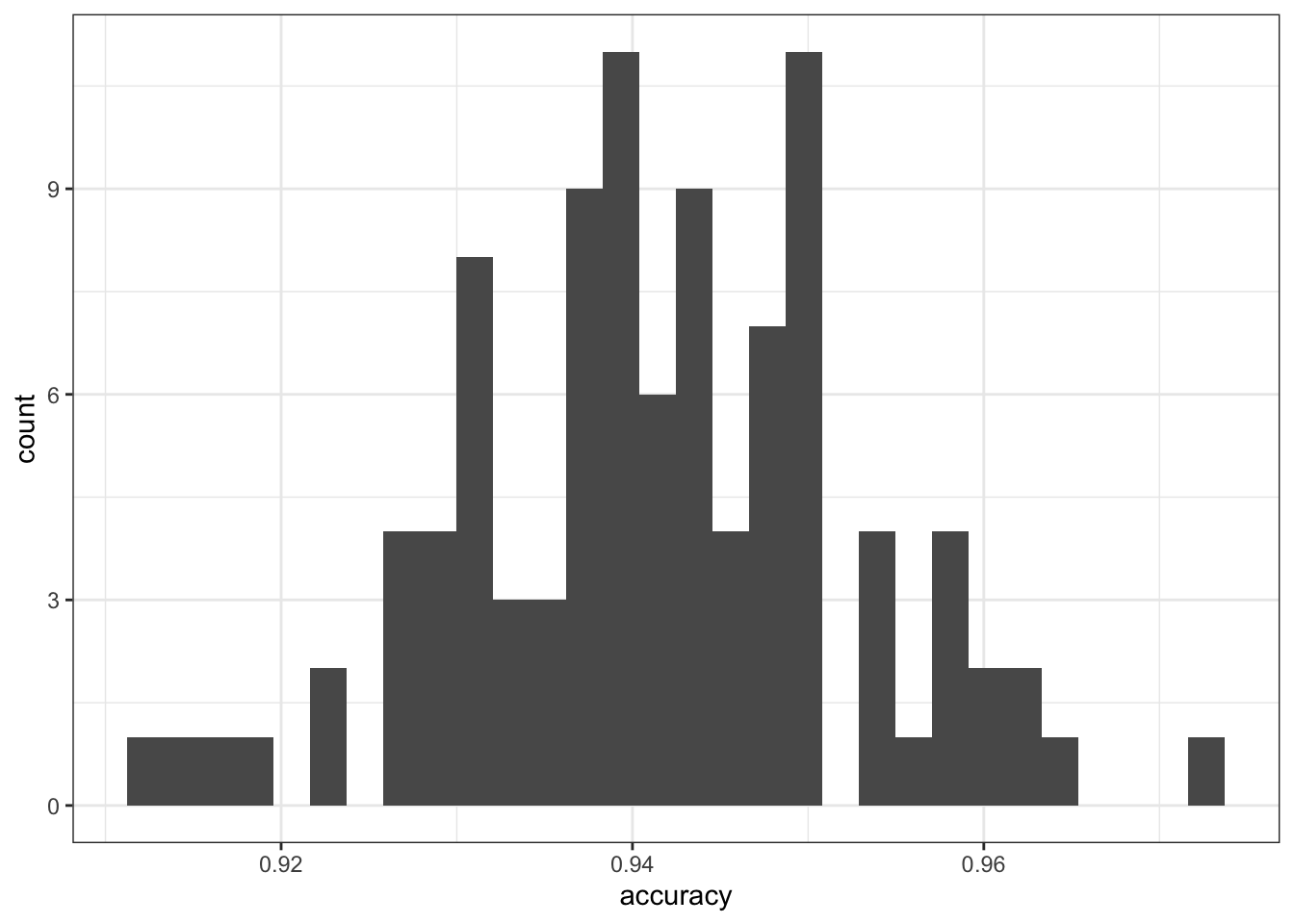 We get several statistics here. On either pole of the output we see the minimum and maximum values contained in the vector. In my case, the worst model achieved an accuracy of 91% while the best model achieved an accuracy of 97%. In between these two poles we have the median and the arithmetic mean, the colloquial (sometimes even pedestrian) average. In my case, both the medium and the mean landed on 94.2%, indicating both that the module robustly achieves an accuracy of 94% and that the accuracies are indeed normally distributed.