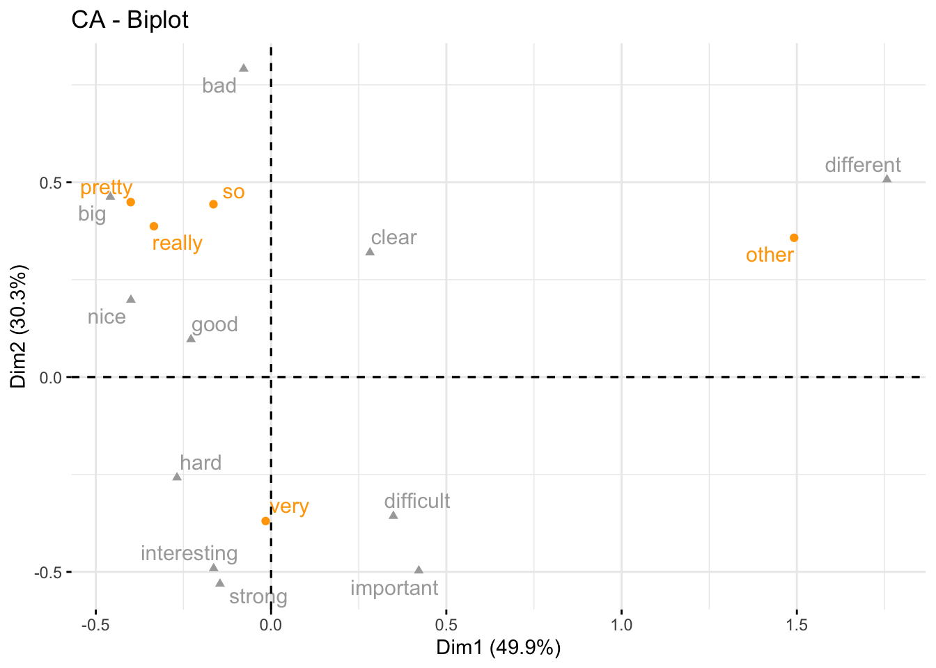 The results of the CA show that the adjective different is collocating with other amplifiers while very is collocating with difficult and important, pretty is collocating with big, really is collocating with nice, and so is collocating with bad.
