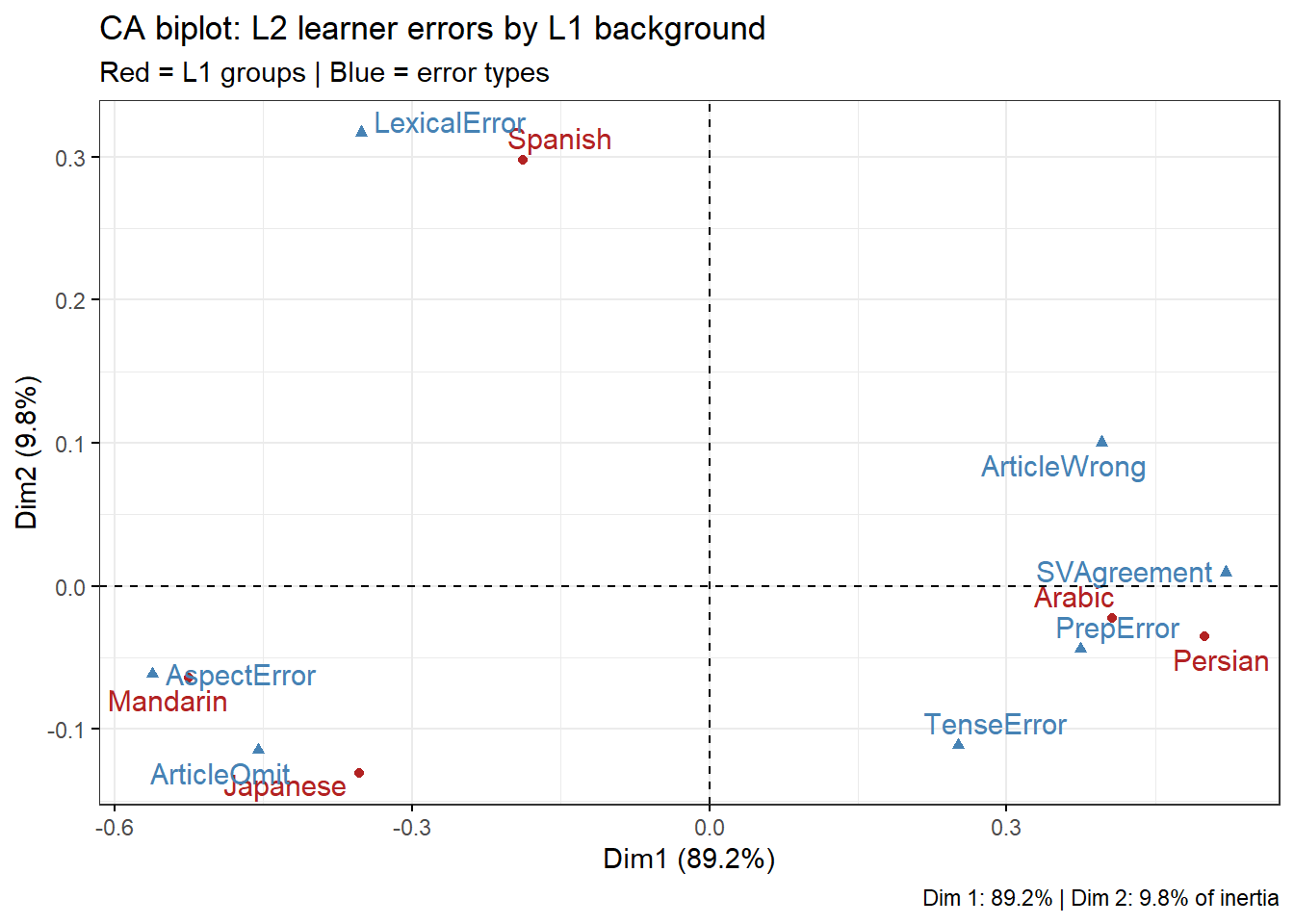 The biplot reveals that Mandarin and Japanese learners cluster together and are characterised by article omissions and aspect errors — consistent with the absence of articles and grammatical aspect in these L1s. Arabic and Persian learners cluster separately, characterised by preposition errors and article confusion — reflecting different L1 transfer patterns. Spanish learners are positioned between the two groups, with a distinctive lexical error profile.