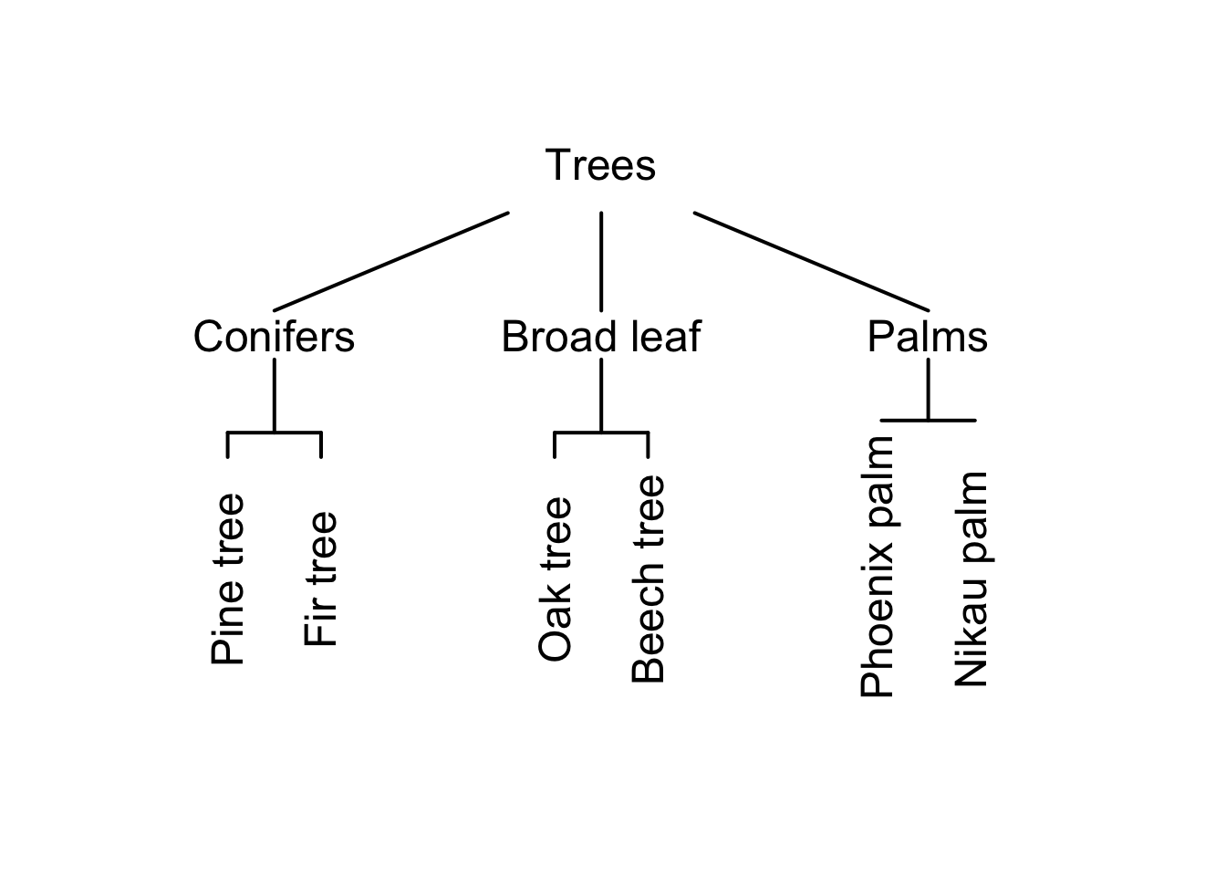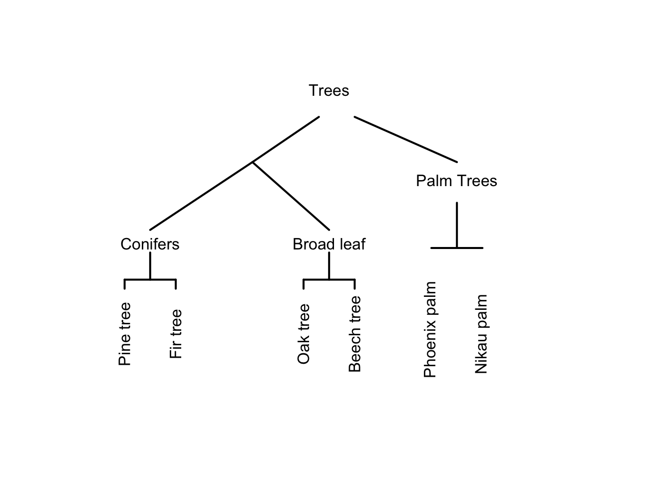 In this display, conifers and broad-leaf trees are grouped together because there are more similar to each other compared to palm trees. This poses the question of what is meant by similarity. Consider the display below.