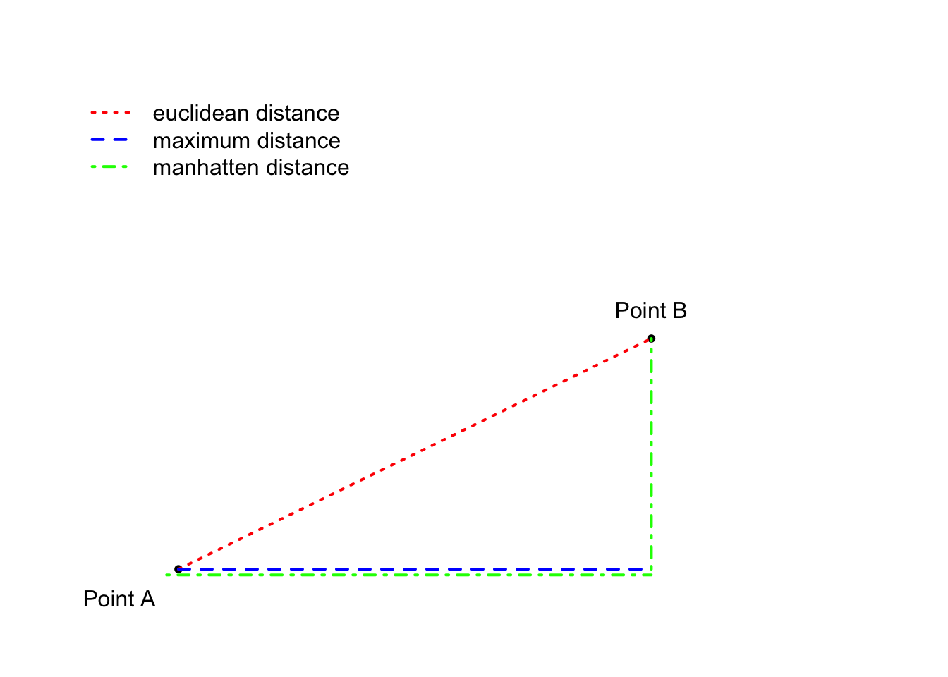 The Figure above depicts three ways to measure distance: the euclidean distance represents the distance between points as the hypotenuse of the x- and y-axis distances while the “maximum distance” represents distance as the longer distance of either the distance on the x- or the y-axis. The manhatten distance (or block distance) is the sum of the distances on the x- and the y-axis.