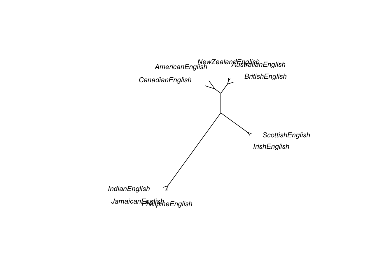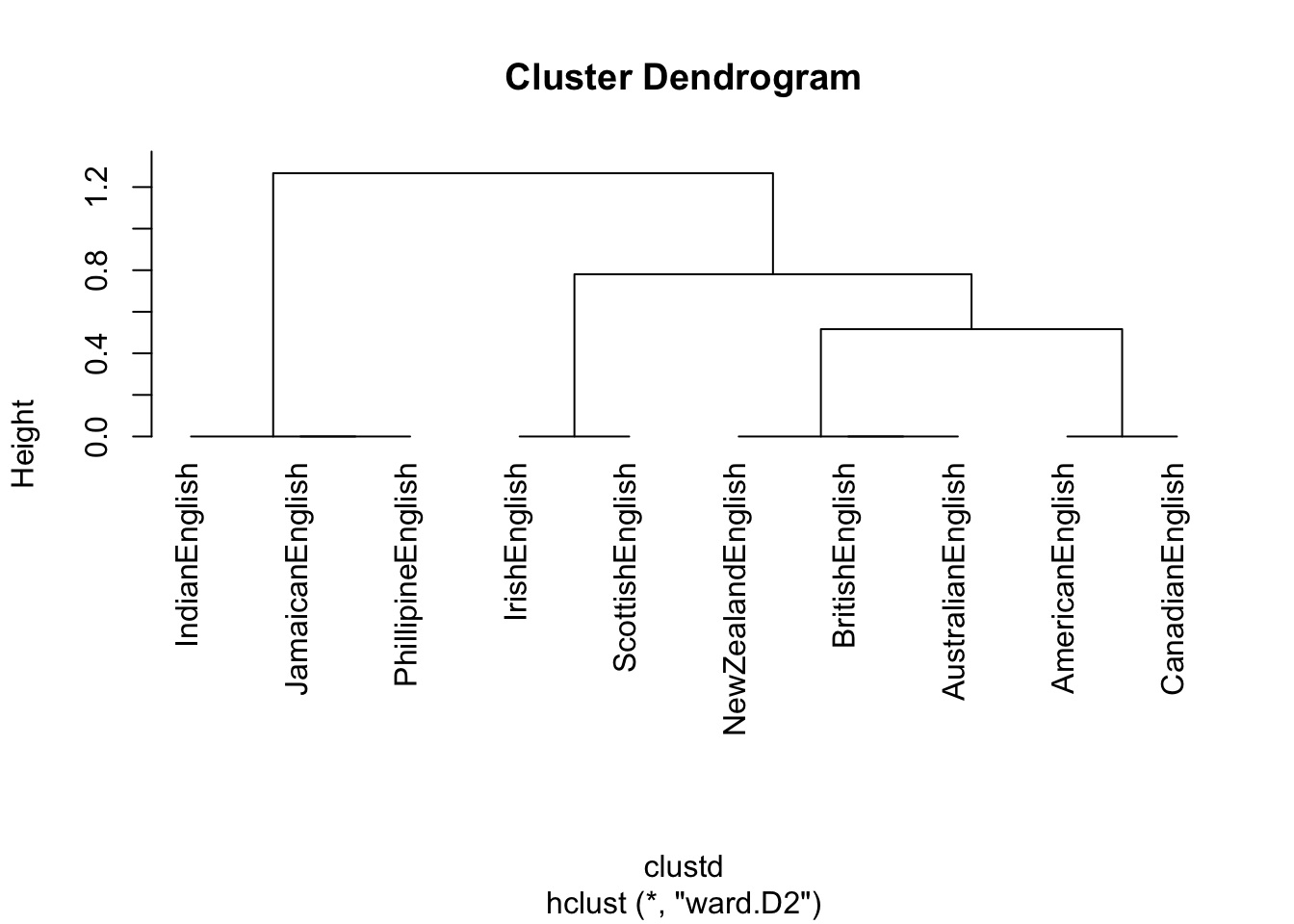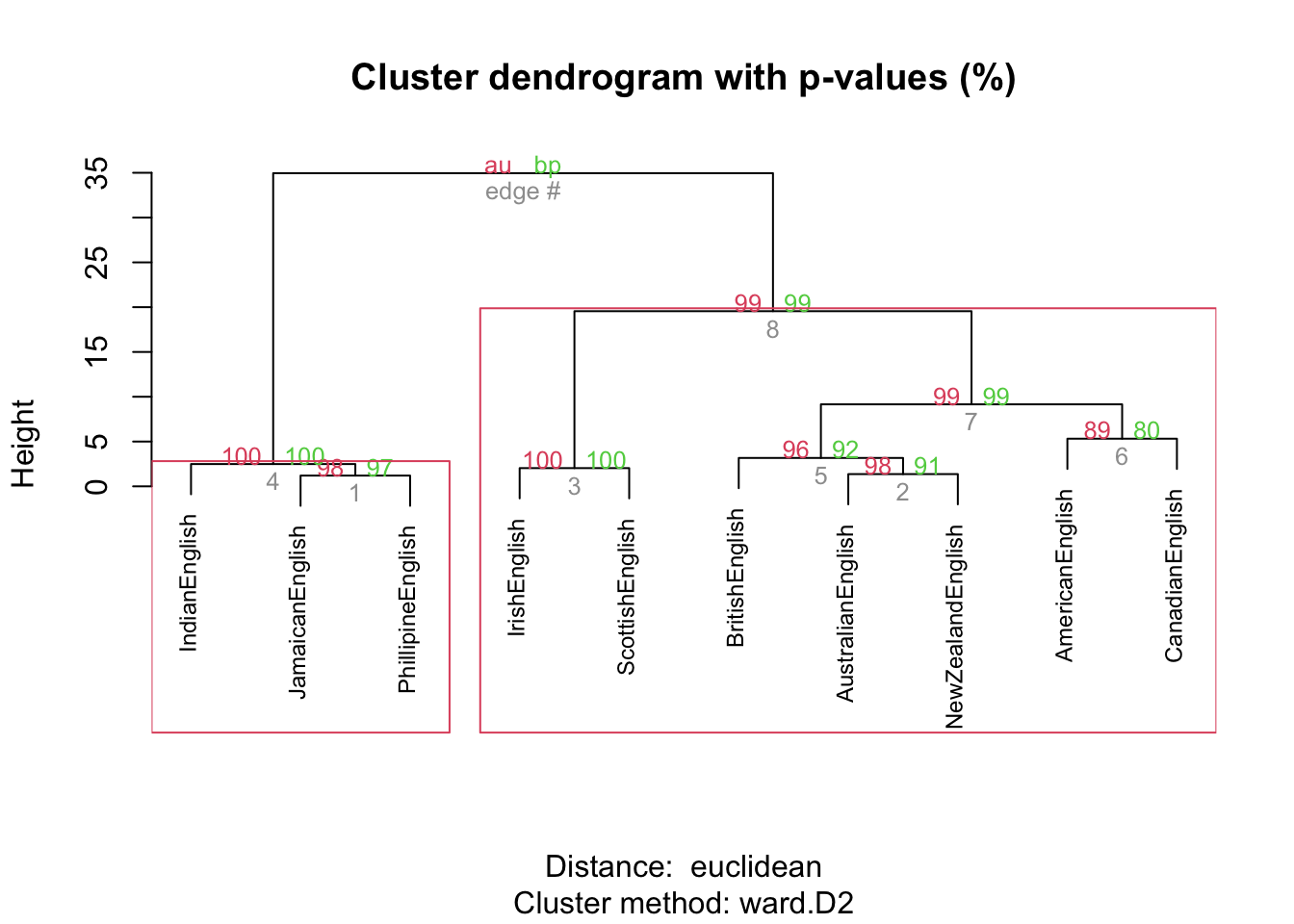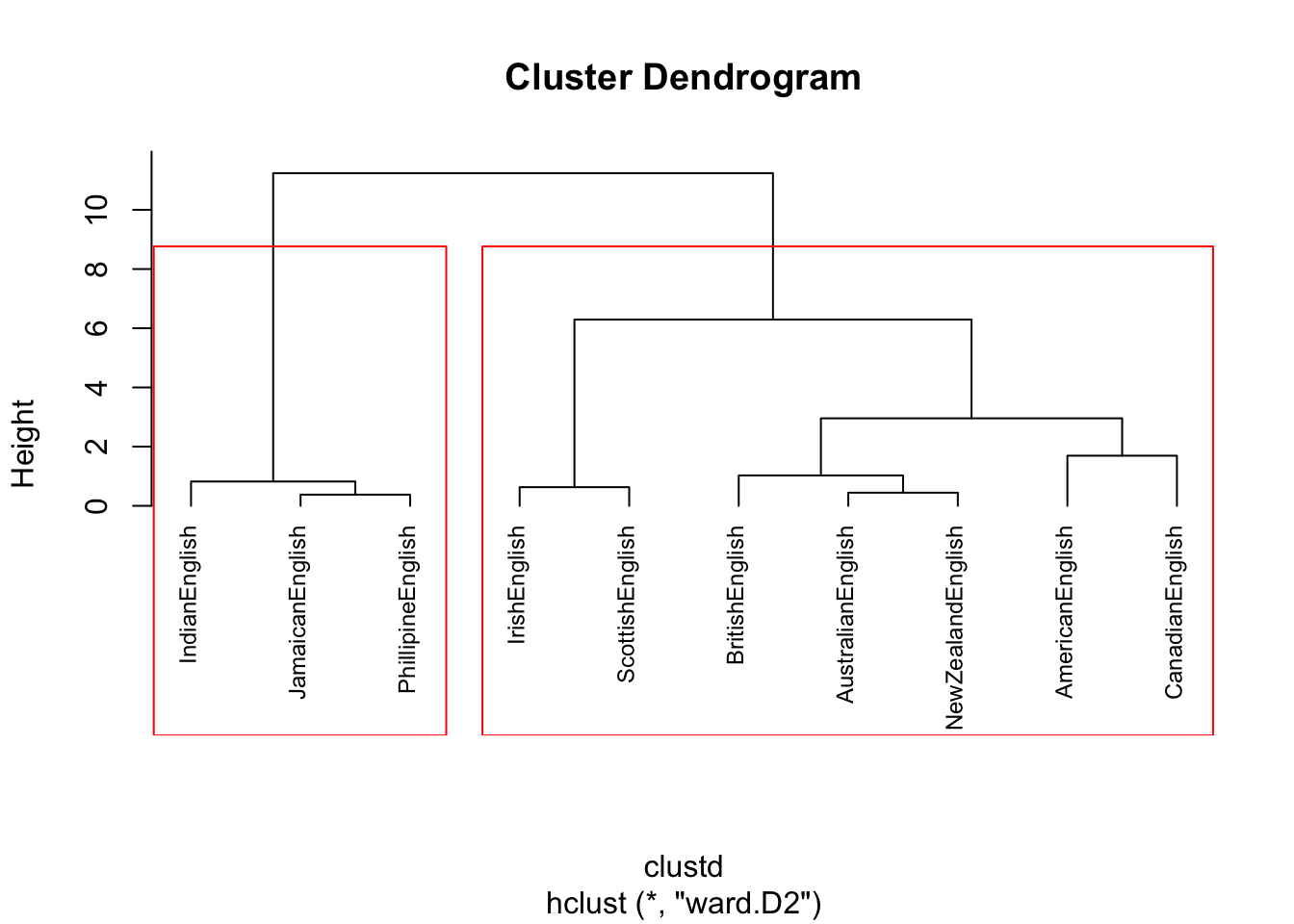 The most common method in linguistics that is sued to detect groups in data are cluster analyses. Cluster analyses are common in linguistics because they not only detect commonalities based on the frequency or occurrence of features but they also allow to visualize when splits between groups have occurred and are thus the method of choice in historical linguistics to determine and show genealogical relationships.