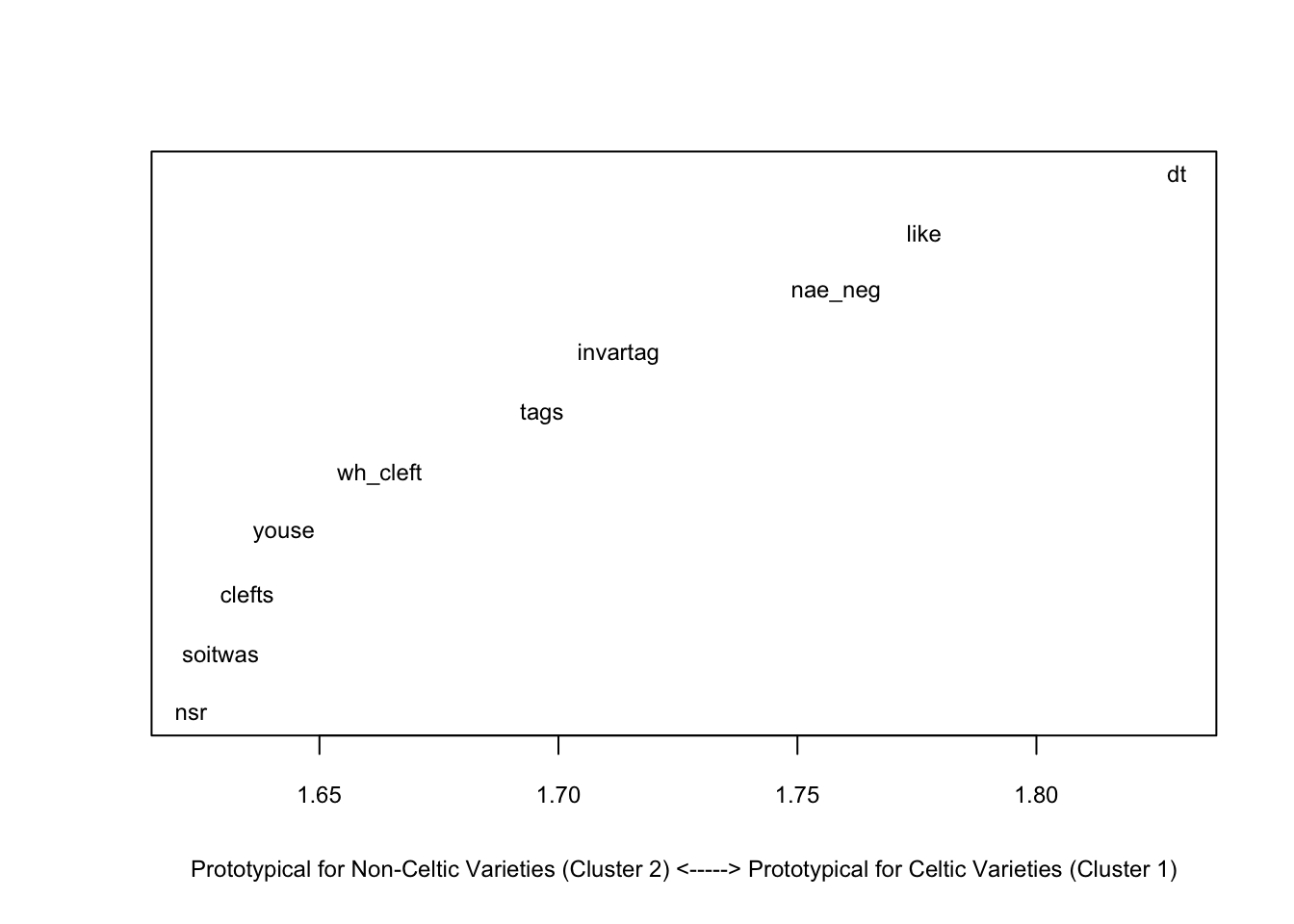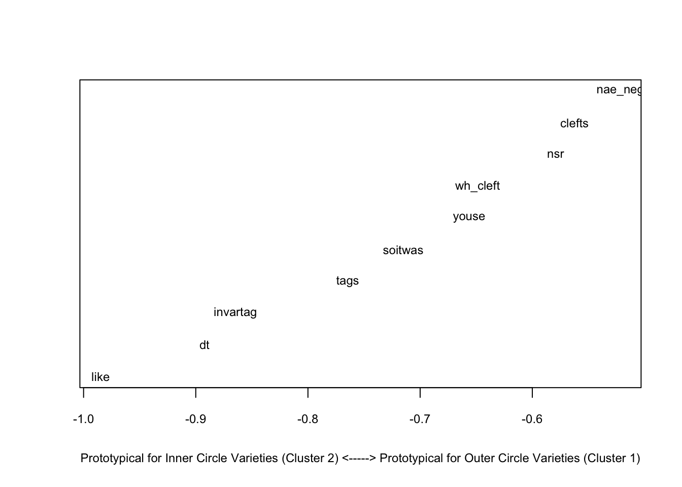 We will now turn to another example in order to delve a little deeper into how clustering algorithms work. In this example, we will find cluster of varieties of English based on the relative frequency of selected non-standard features (such as the relative frequencies of cleft constructions and tag questions). As a first step, we generate some fictional data set for this analysis.
