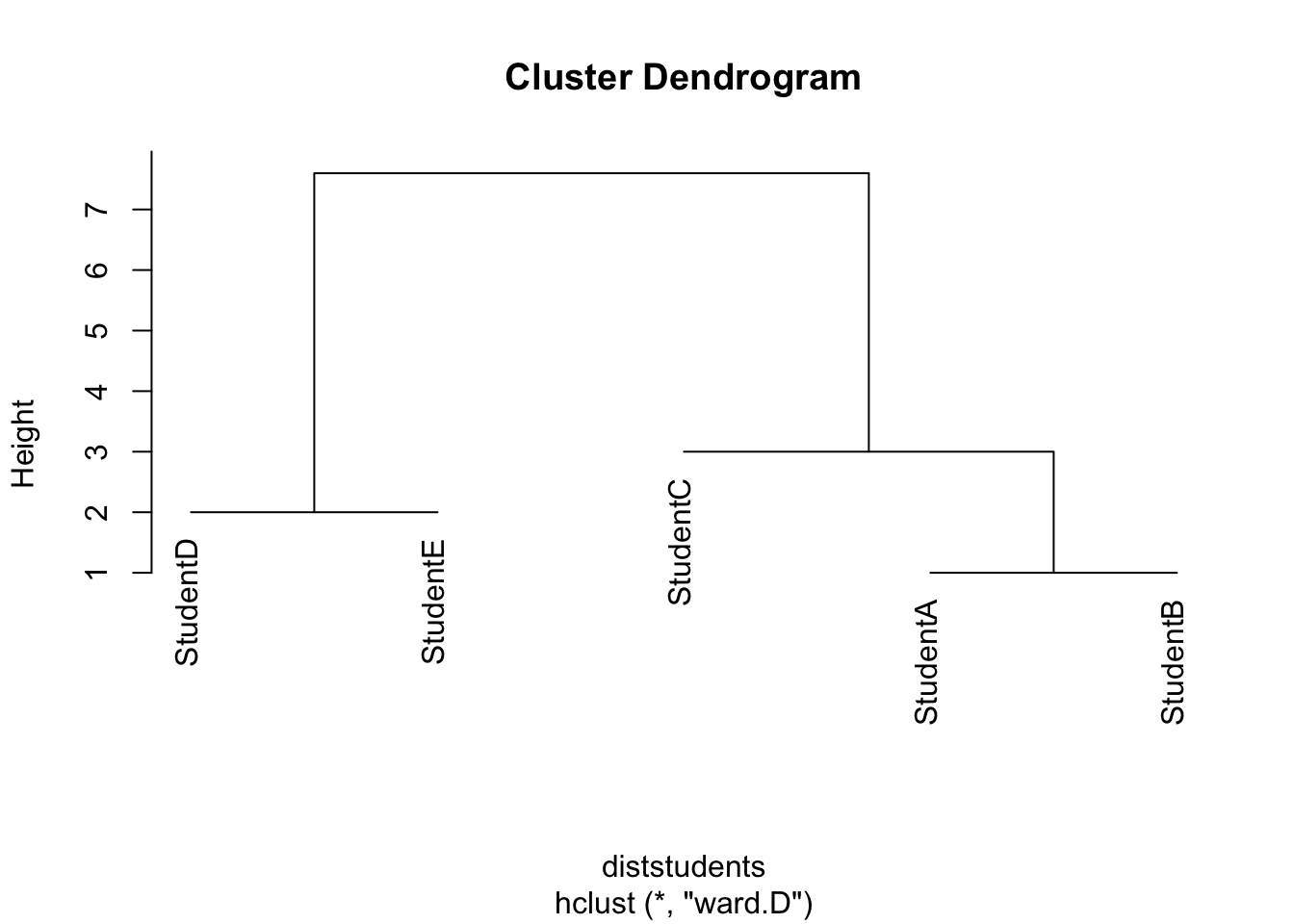 diststudents2 <- dist(students2, method = "manhattan")Student | Cluster 1 | Student C | Student D |