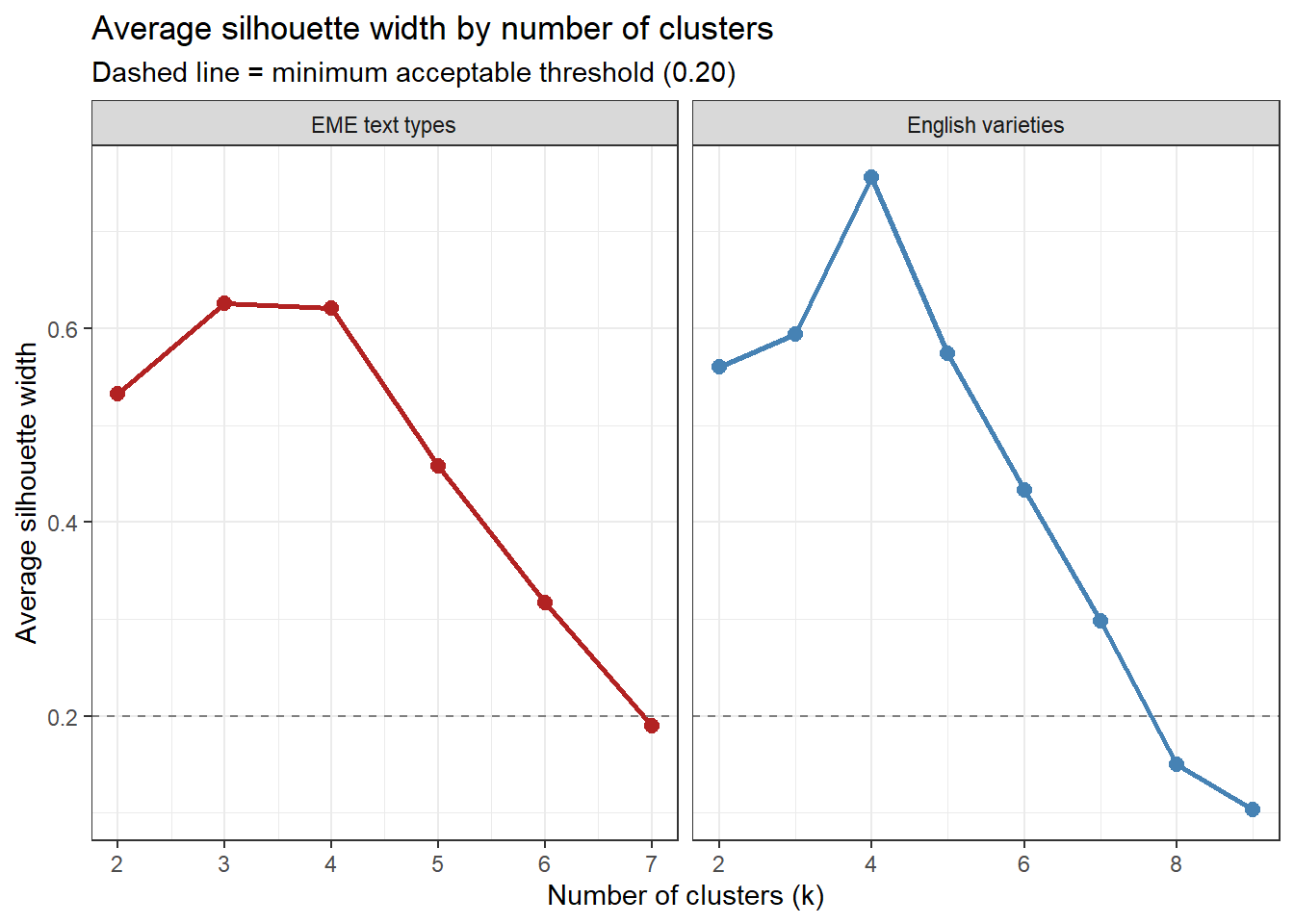 Best linguistic use case | Dialect/language typology; EME register; exploratory analysis | Large-scale text clustering; speaker segmentation; confirmation of HCA | Amplifier/collocation patterns; L2 error profiles; register × feature associations |