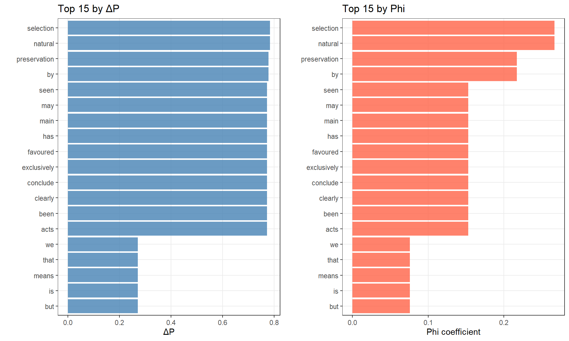 - Frequency-independent: Unlike χ², MI, and t-score, it’s not inflated by high word frequencies
