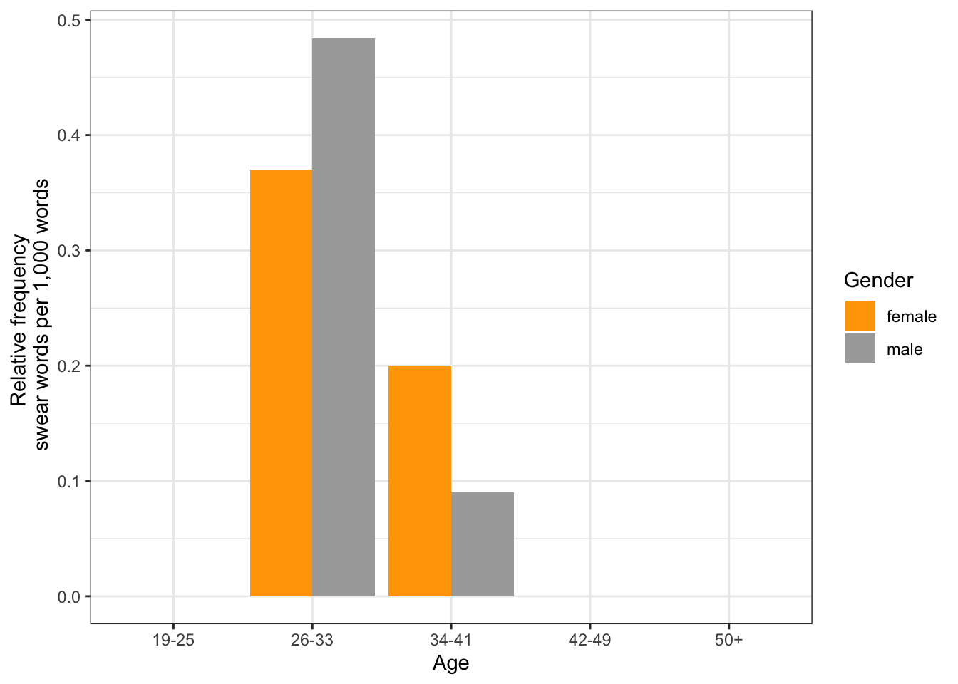 Now that we have prepared our data, we can plot swear word use by gender.