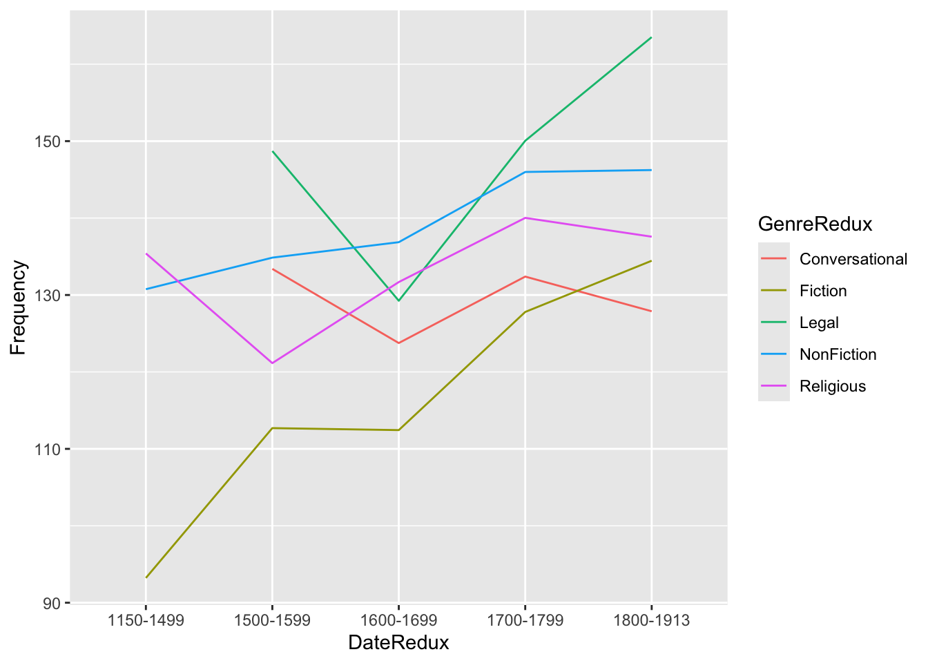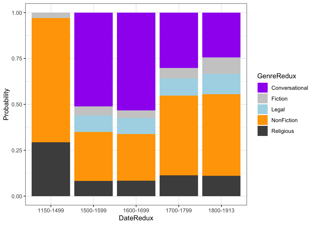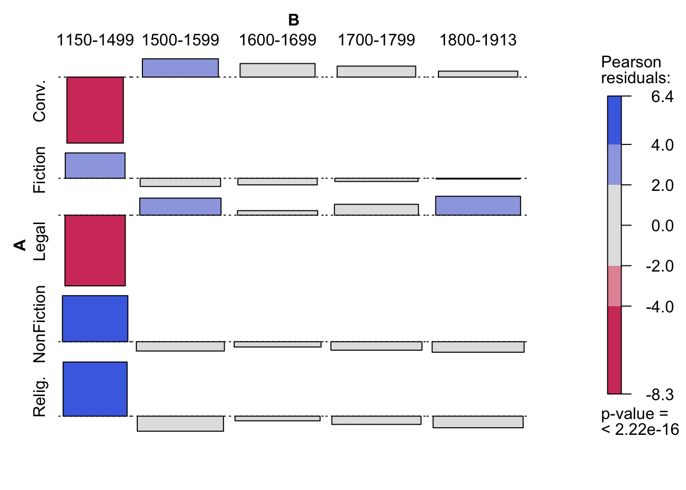 According to the mosaic plot above, there are some potentially significant differences in the first and second period. This, however, is still likely to be caused by the absence of data points from conversational or legal texts in the first period. Also, the absence of boxes for these text types in the first period indicate that there is a potential problem - something that was not visible in the mosaic plot!