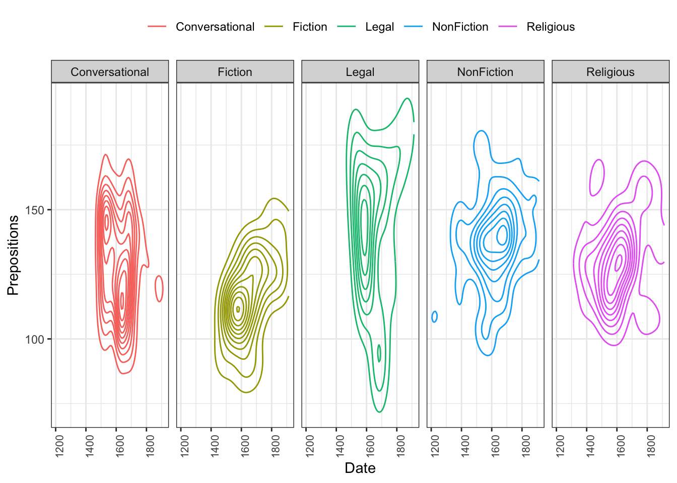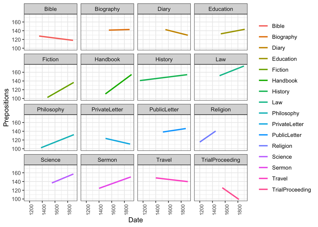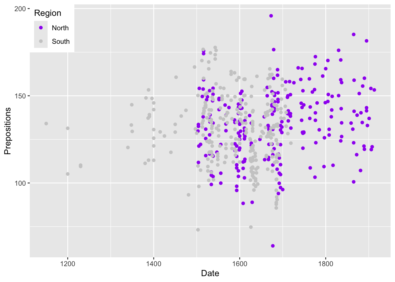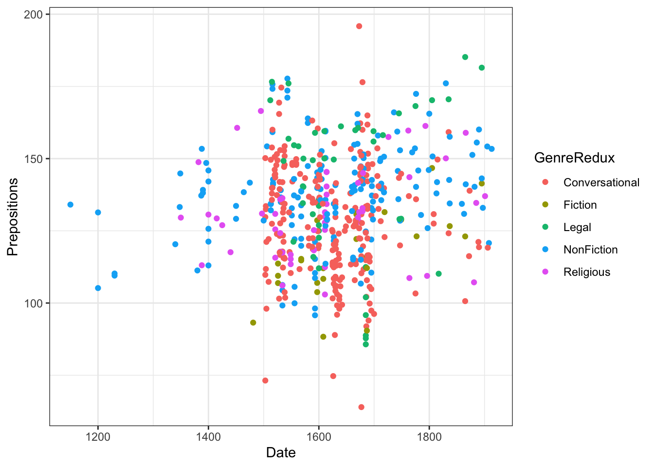 Date | Genre | Text | Prepositions | Region | GenreRedux | DateRedux |