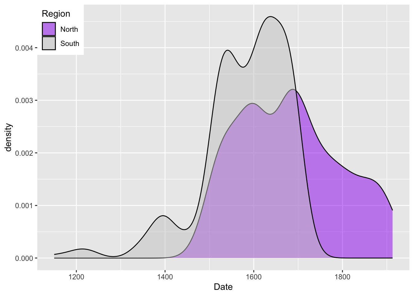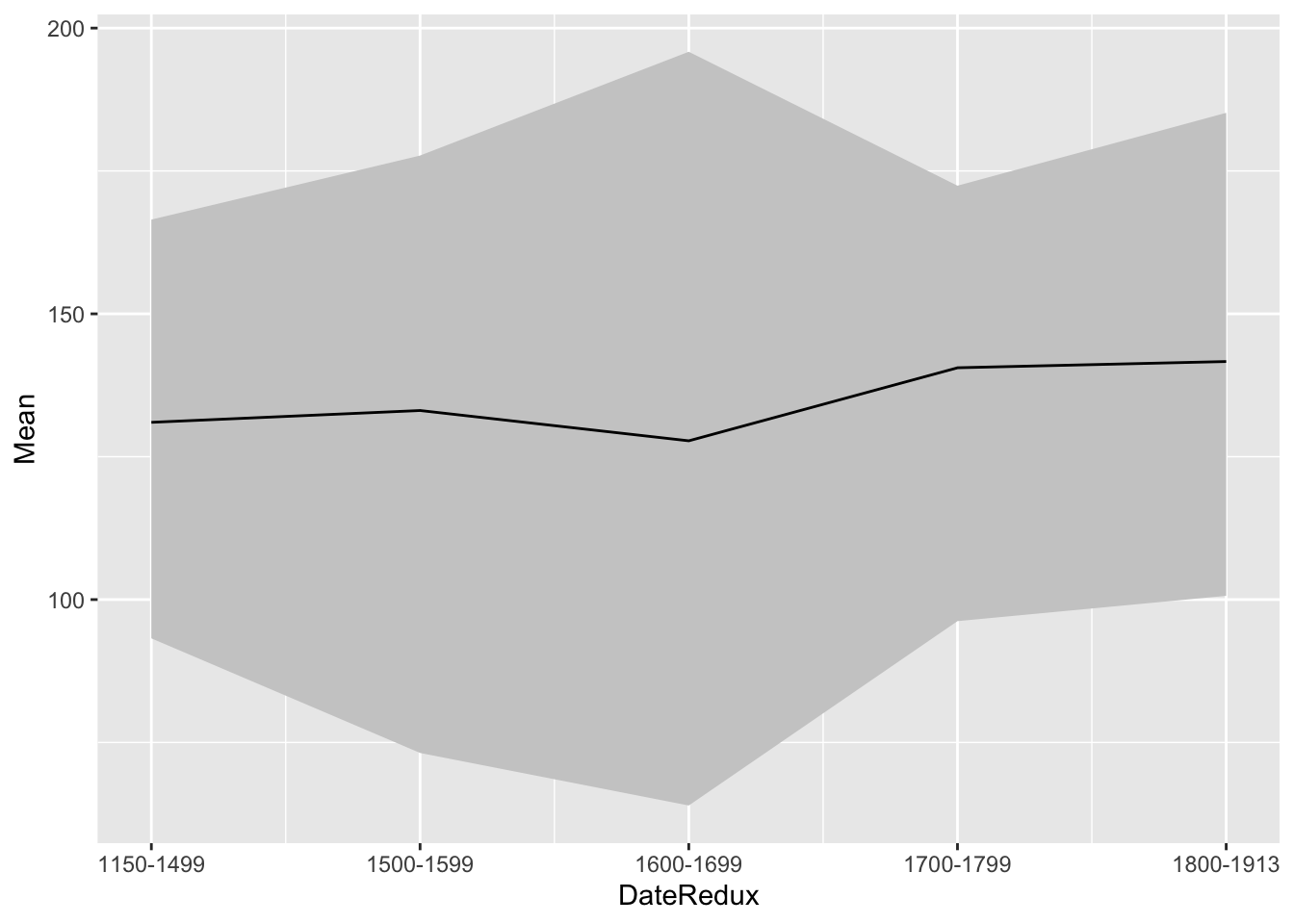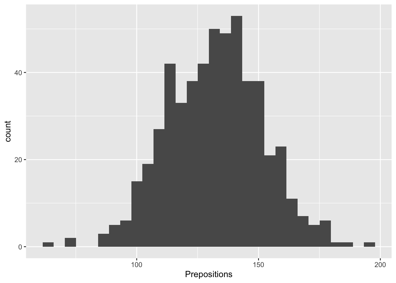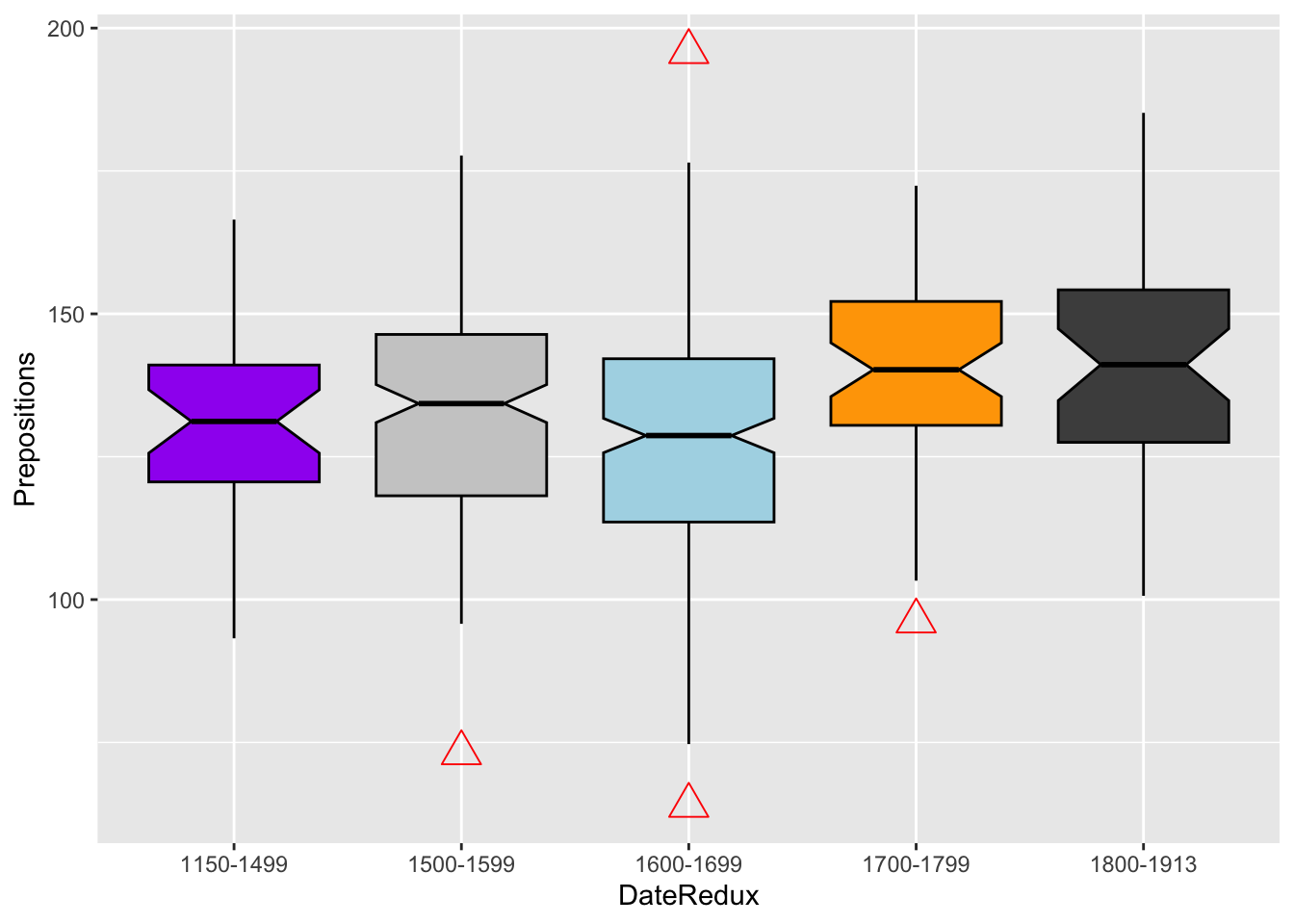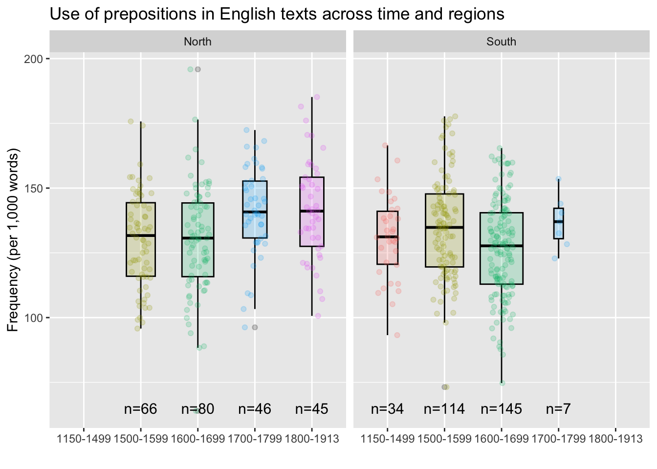 Before turning to the graphs, we load the data that we will display. The data set is called lmmdata but we will change the name to pdat for this tutorial. The data set is based on the Penn Parsed Corpora of Historical English (PPC) and it contains the date when a text was written (Date), the genre of the text (Genre), the name of the text (Text), the relative frequency of prepositions in the text (Prepositions), and the region in which the text was written (Region). We also add two more variables to the data called GenreRedux and DateRedux. GenreRedux collapses the existing genres into five main categories (Conversational, Religious, Legal, Fiction, and NonFiction) while DateRedux collapses the dates when the texts were composed into five main periods (1150-1499, 1500-1599, 1600-1699, 1700-1799, and 1800-1913). We also factorize non-numeric variables.