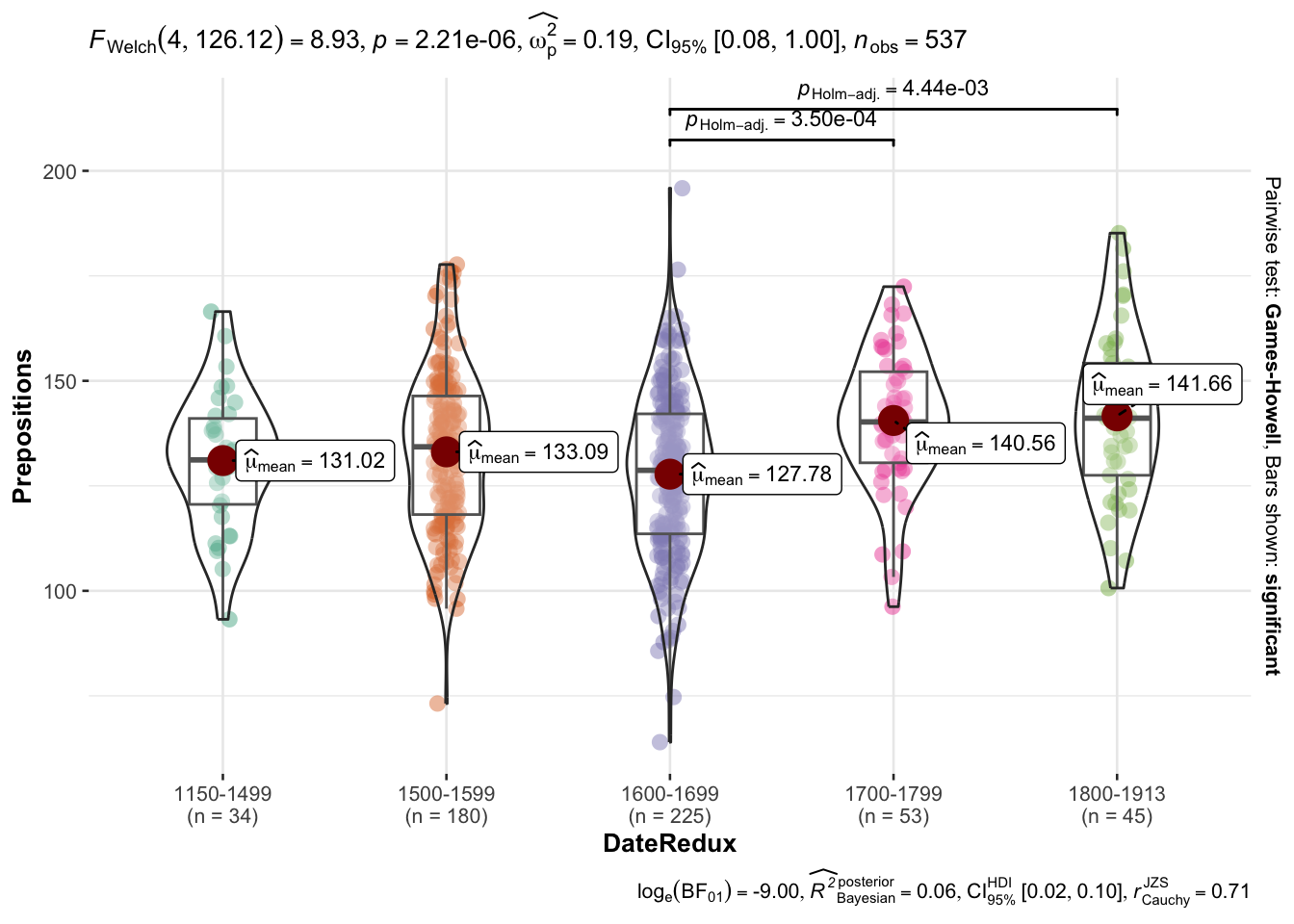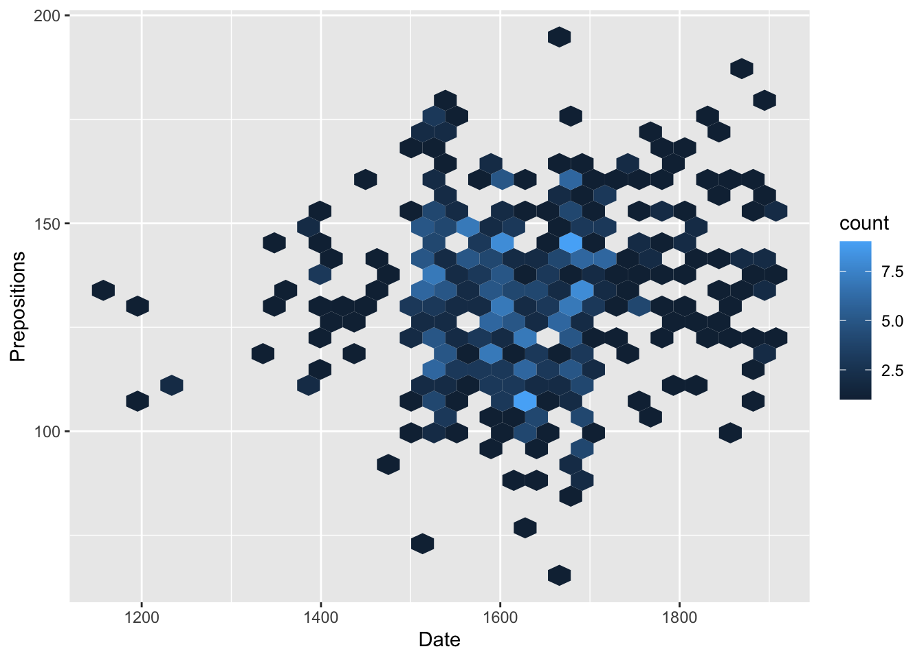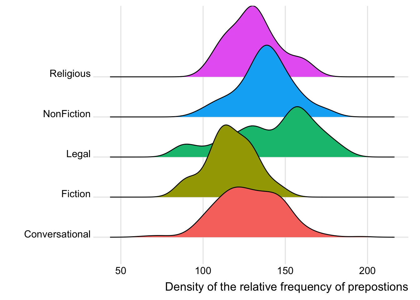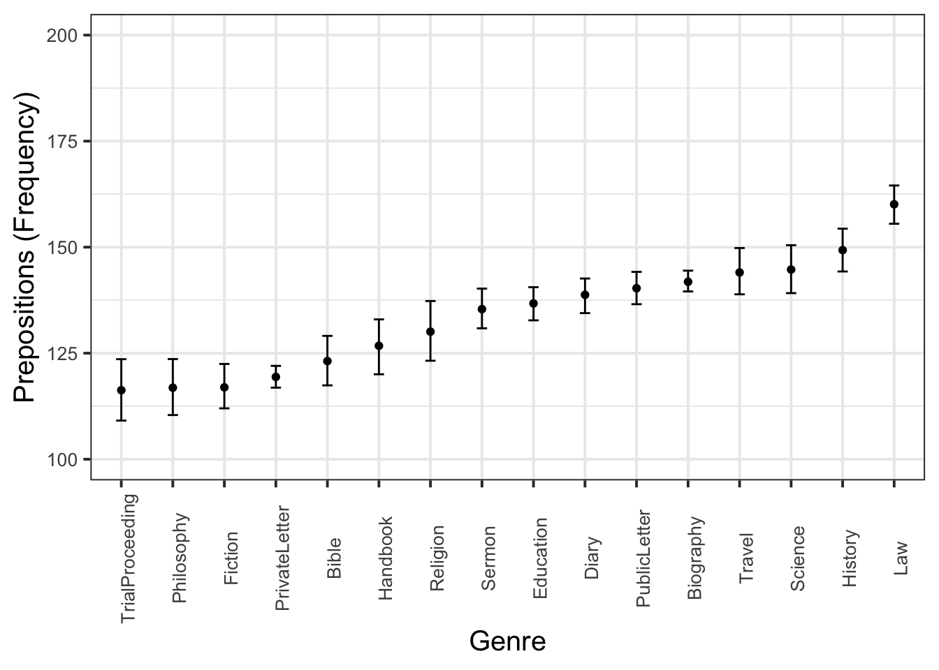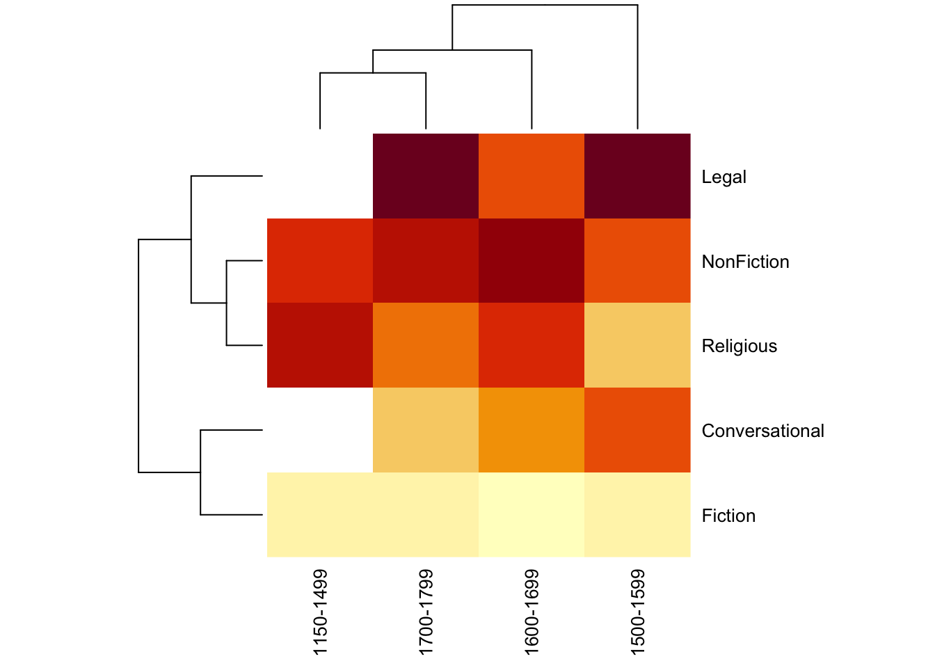 The dendrogram on the top shows that documents from 1600 and 1700 as well as documents from 1800 and 1900 are grouped together and thus are more similar with respect to their preposition frequencies. The dendrogram on the left indicates that we have two categories of documents: the genres to towards the bottom tend to have fewer prepositions (indicated by the light colours) while the documents to the top tend to have more prepositions (thus the darker hues). Legal texts (genre = Law) have notably higher rates of prepositions as is derivable from the dark red colour of such texts.