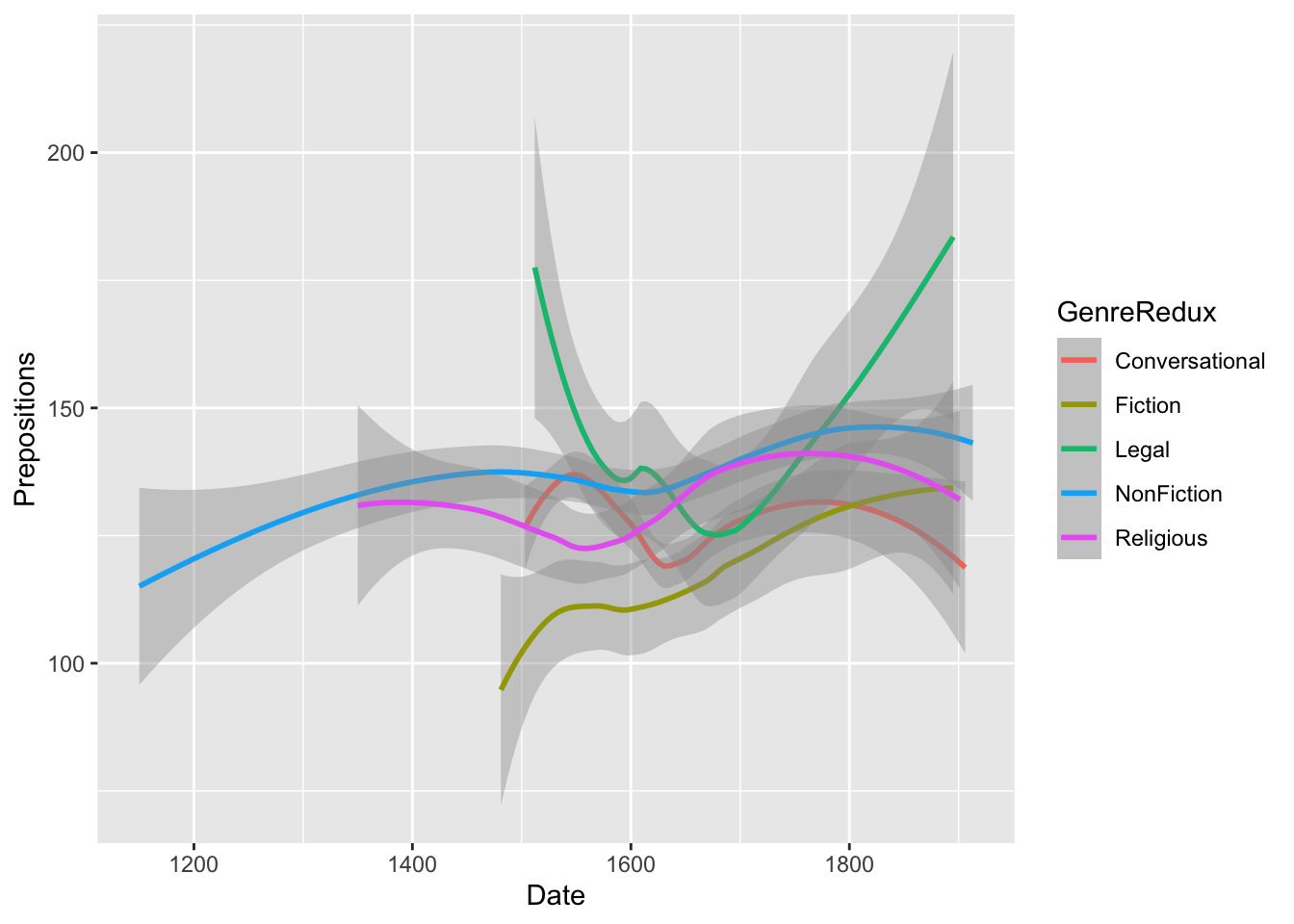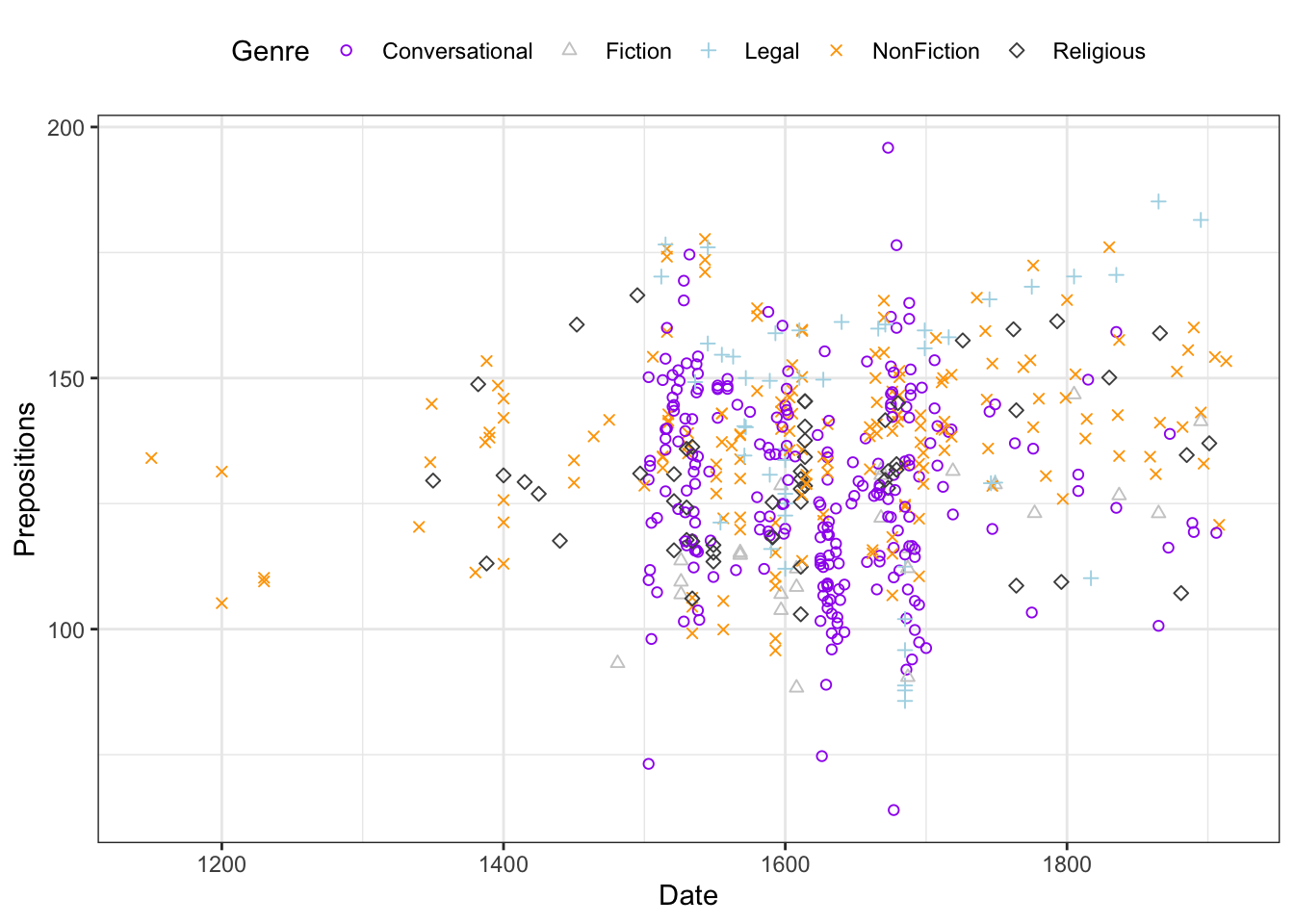 ggplot(pdat, aes(Date, Prepositions, color = GenreRedux, shape = GenreRedux)) +