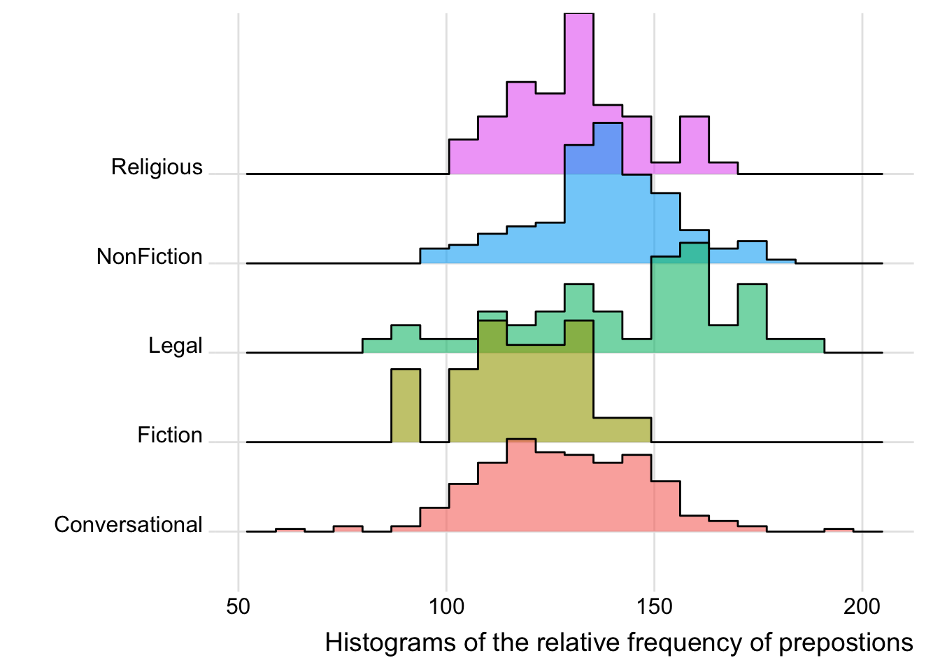 The bars above the line indicate that the observed frequency is higher than expected, bars under the line indicate frequencies that are lower than expected. Darker shades of blue and red coloring suggest that there are significant differences between the observed and the expected frequencies. In the present example, this means that the frequencies of prepositions differ significantly across genres and periods. However(!) as shown in the table above, this result is an artifact because the first period does not contain any data points for conversational or legal texts!