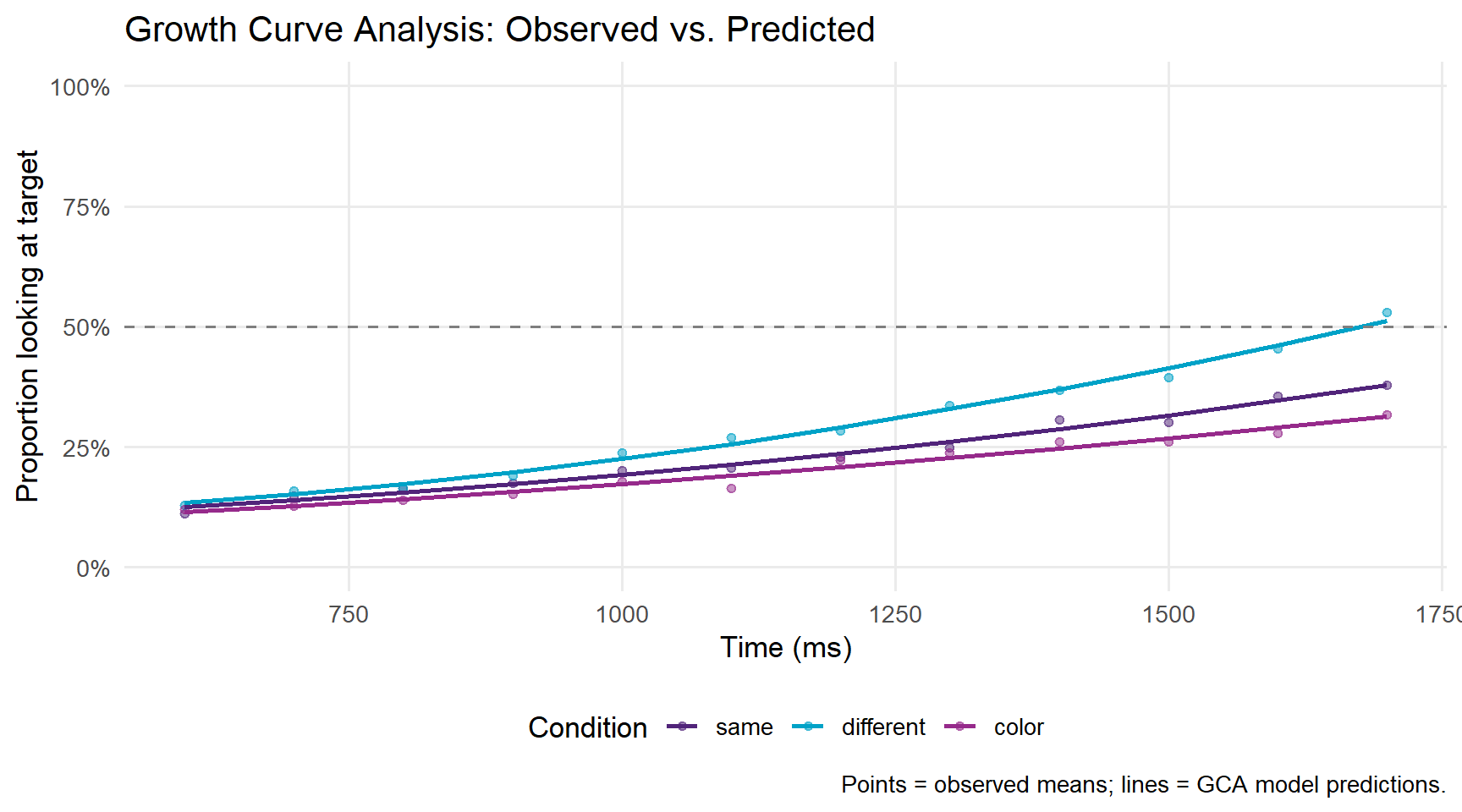 caption = "Points = observed means; lines = GCA model predictions.") +