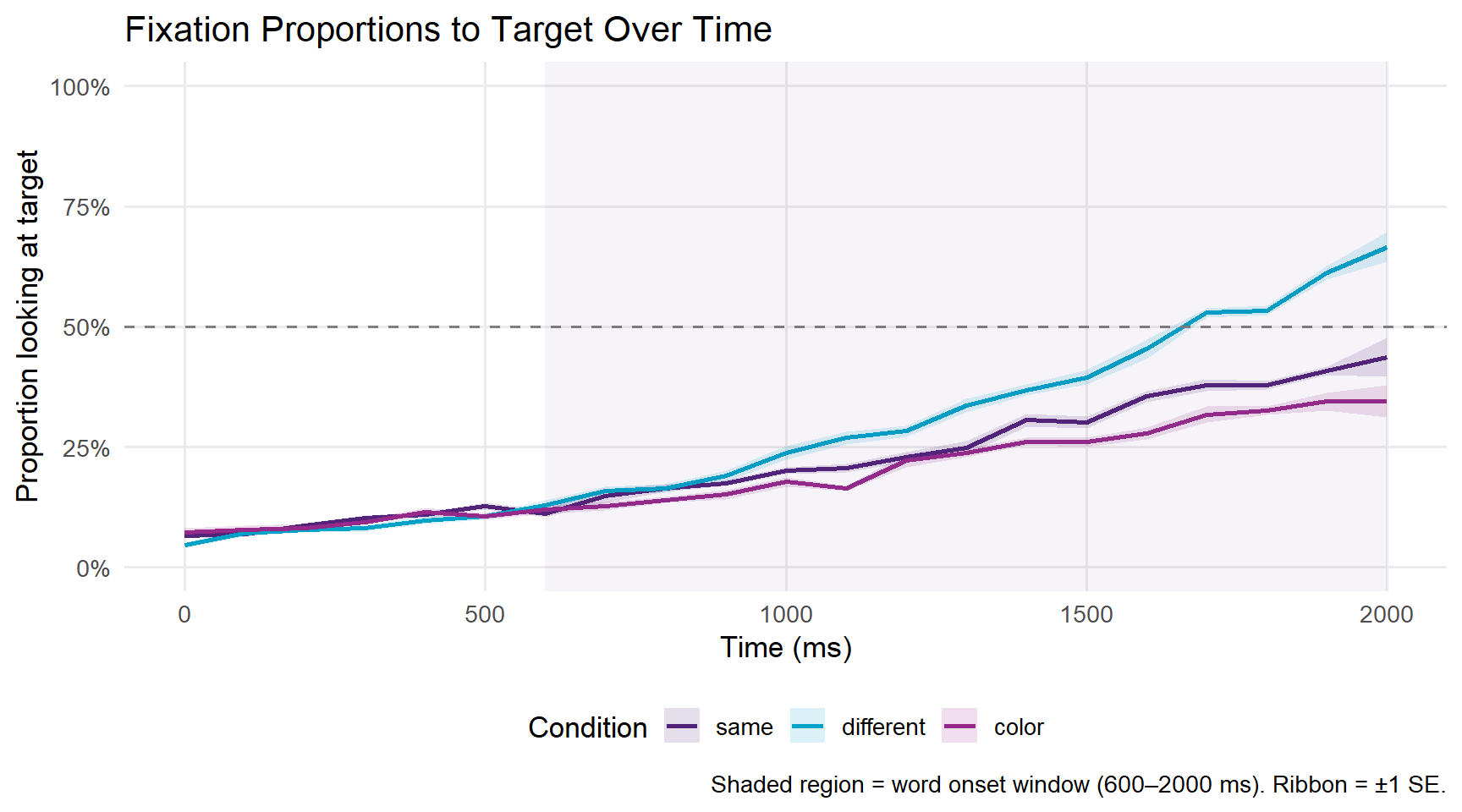 In a typical Visual World Paradigm experiment, a participant sits in front of a screen displaying two or more images (the “visual world”) while wearing an eye-tracker. They hear a spoken sentence that refers to one of the images — the target — while the other image(s) serve as competitors or distractors. The central measurement is the proportion of time the participant looks at the target image in each time window, which reflects how strongly the spoken input guides their attention.