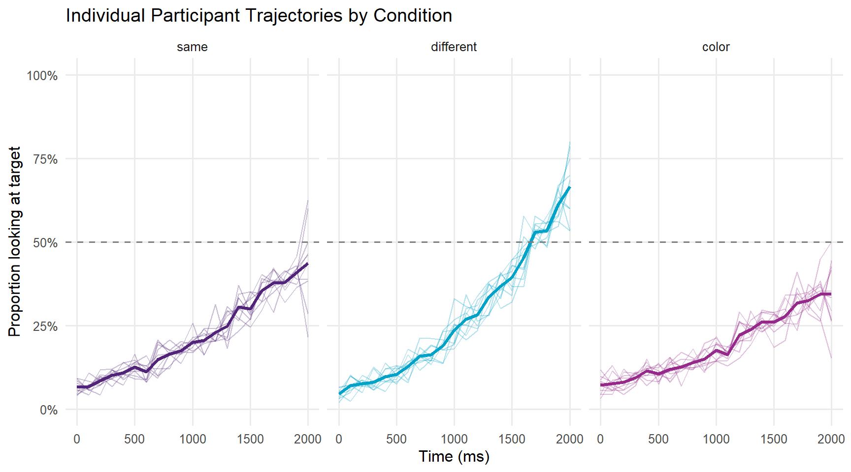 Two aspects of the structure call for particular care. First, the dependent variable — proportion of time looking at the target — is bounded between 0 and 1, which means that ordinary linear models are technically inappropriate; logistic or arcsine-transformed versions are preferable (Barr 2008). Second, the time course of looking is itself the primary signal of interest, and any analysis method that collapses across time (such as a simple t-test on mean proportions in an analysis window) discards the richest information the data contain. The most powerful modern analyses — mixed-effects logistic regression (Barr 2008), growth curve analysis (Mirman 2014), and GAMMs (Wieling 2018) — all retain or model the time dimension explicitly.