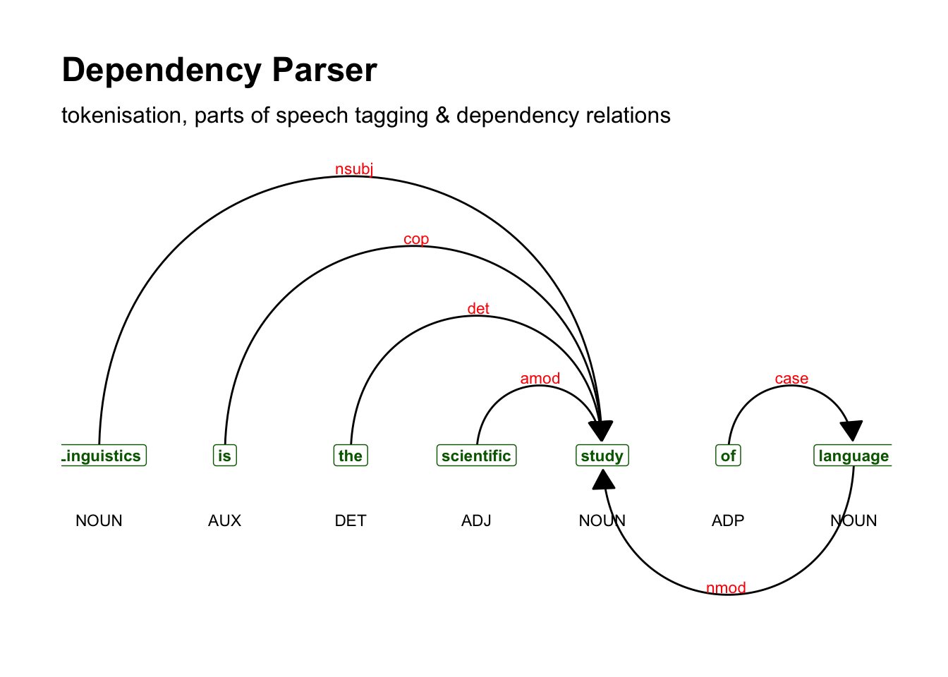 In addition to pos-tagging, we can also generate plots showing the syntactic dependencies of the different constituents of a sentence. For this, we generate an object that contains a sentence (in this case, the sentence Linguistics is the scientific study of language), and we then plot (or visualize) the dependencies using the textplot_dependencyparser function.