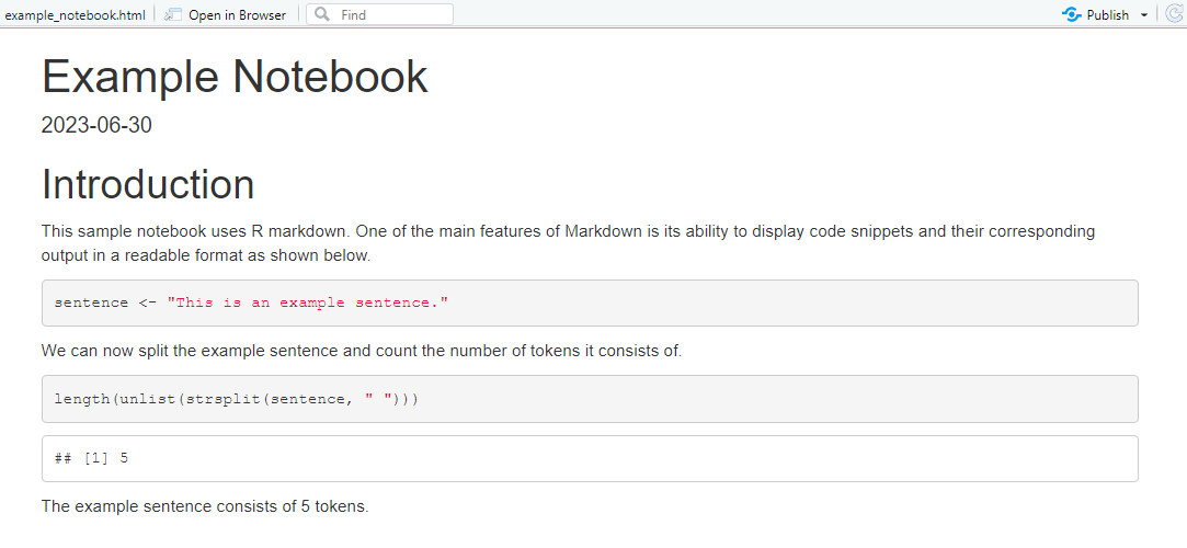 The key property of a rendered notebook is that every result is derived directly from code. There is no manual copying of numbers from a statistical output into a Word document — a step that is both error-prone and opaque. When a reviewer asks “where does this number come from?”, you can point directly to the code chunk that produced it.