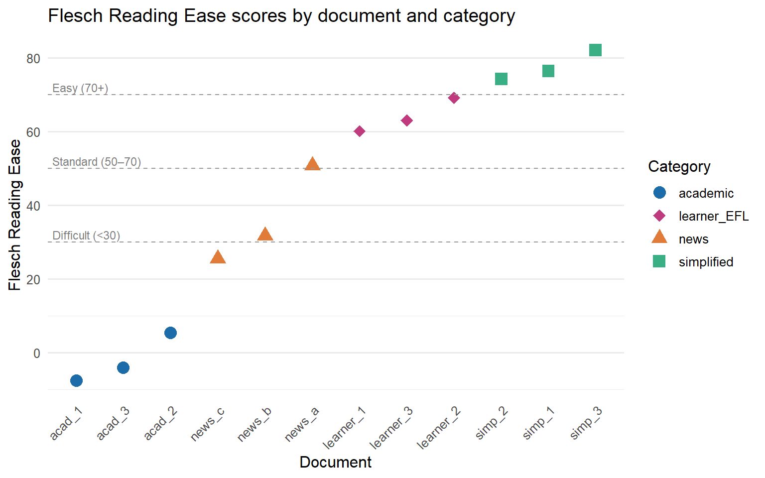 The learner essay scores are worth examining carefully, because they can appear counterintuitive at first glance. Learner essays at the B2 level often score as relatively *easy* on Flesch Reading Ease and relatively *low* on Flesch-Kincaid Grade Level, despite being produced by university students writing on complex topics. This pattern arises because B2 learners tend to use shorter, more frequent vocabulary items and shorter sentences than native-speaker academic writers, even when the topic is similar. The surface simplicity of learner language does not reflect conceptual simplicity — it reflects the learner's constrained productive vocabulary and tendency to avoid syntactic risk.