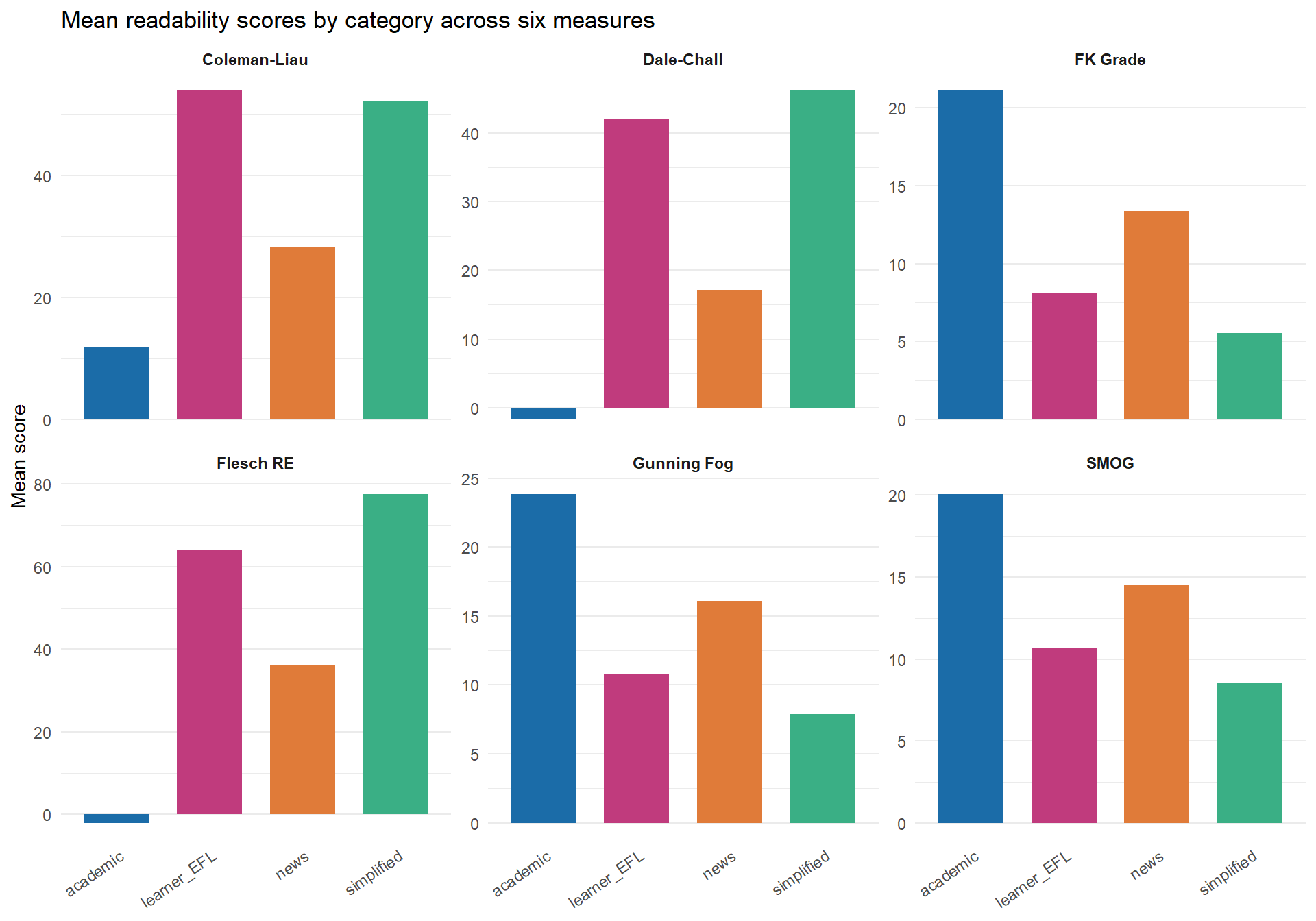 **Q5. When you plot mean readability scores for the four text categories across all six measures in a faceted chart, you notice that learner essays score close to simplified texts on Flesch RE and FK Grade but close to news articles on Dale-Chall. What does this suggest about the nature of learner writing complexity?**