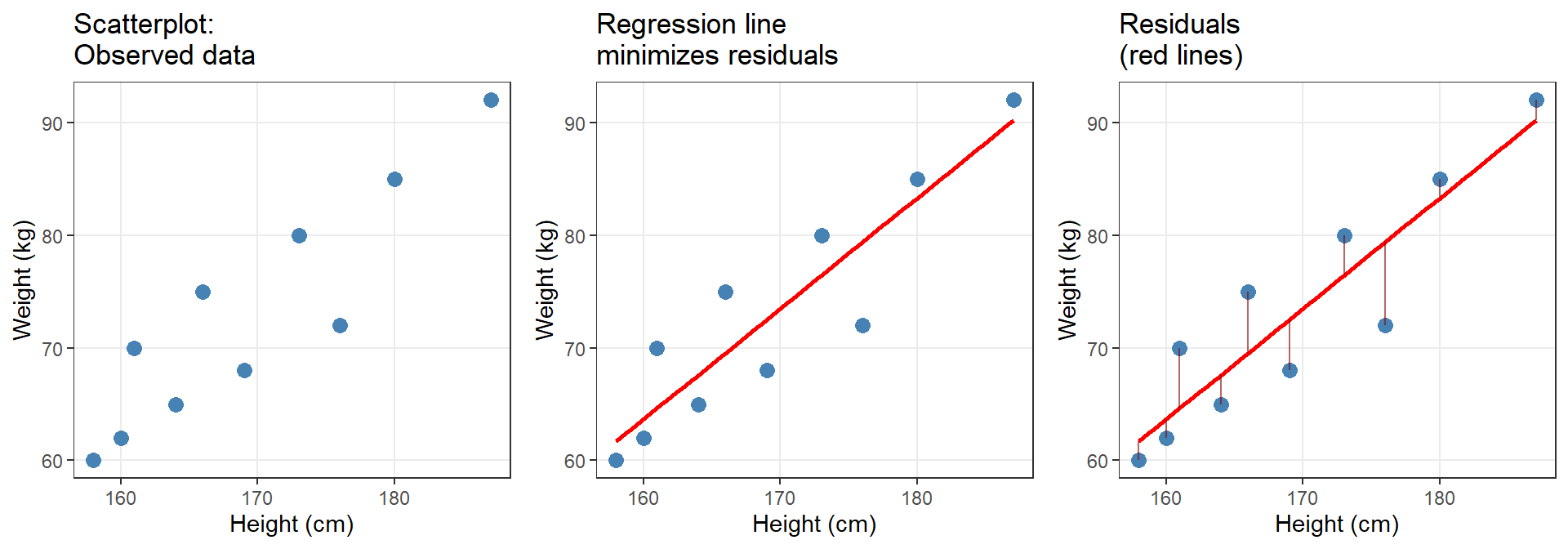 • Prediction: A person who is 180 cm tall is predicted to weigh: \(-93.77 + 0.98 \times 180 = 82.63\) kg.