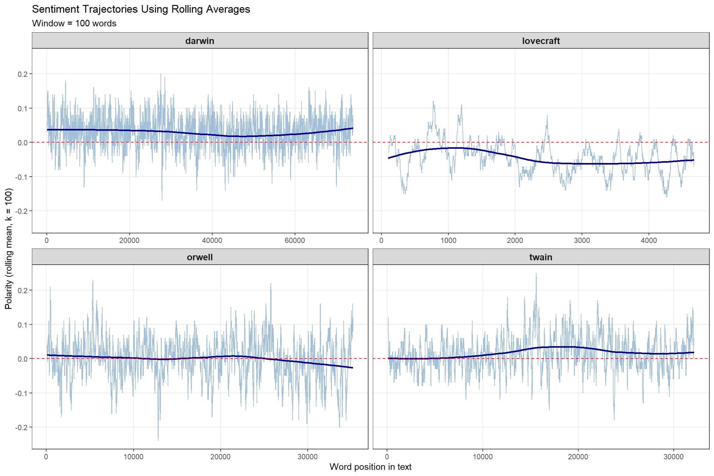 options(scipen = 999) We’ll analyze four classic texts to demonstrate sentiment analysis: