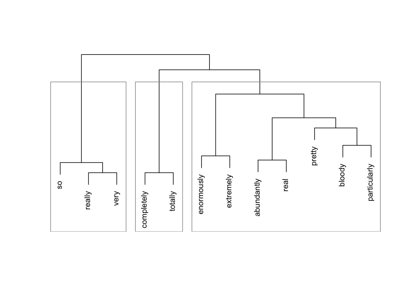It is important to note though that the data set is of rather moderate size which means that differences are unlikely to be detected due to the relative rarity of the amplifier (which is the reason why there is one umbrella cluster). Also, the amplifiers very, so, and really form a cluster together probably due to the fact that really, very, and so are the most frequent “variants” and because they co-occur with the most variety of adjectives. The results can be interpreted to suggest that really, so, and very are “default” amplifiers that lack distinct semantic profiles.