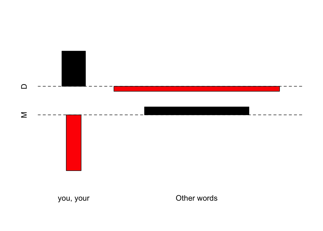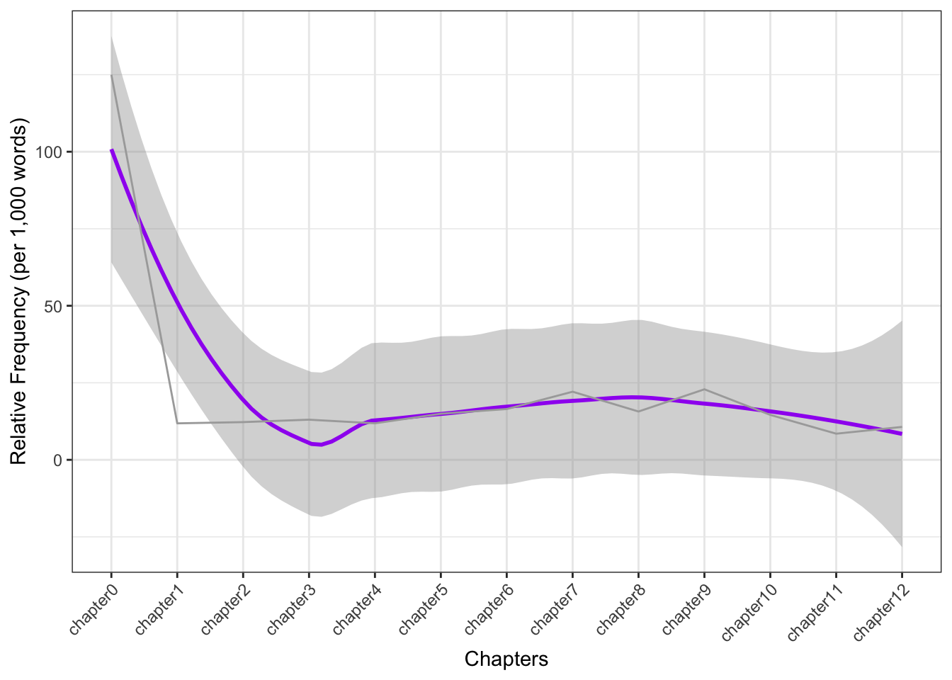 After dividing the data into chapters, we conduct concordancing and extract KWICs (KeyWord In Context). This is accomplished using the kwic function from the quanteda package, which requires three main arguments: the data (x), the search pattern (pattern), and the window size.
