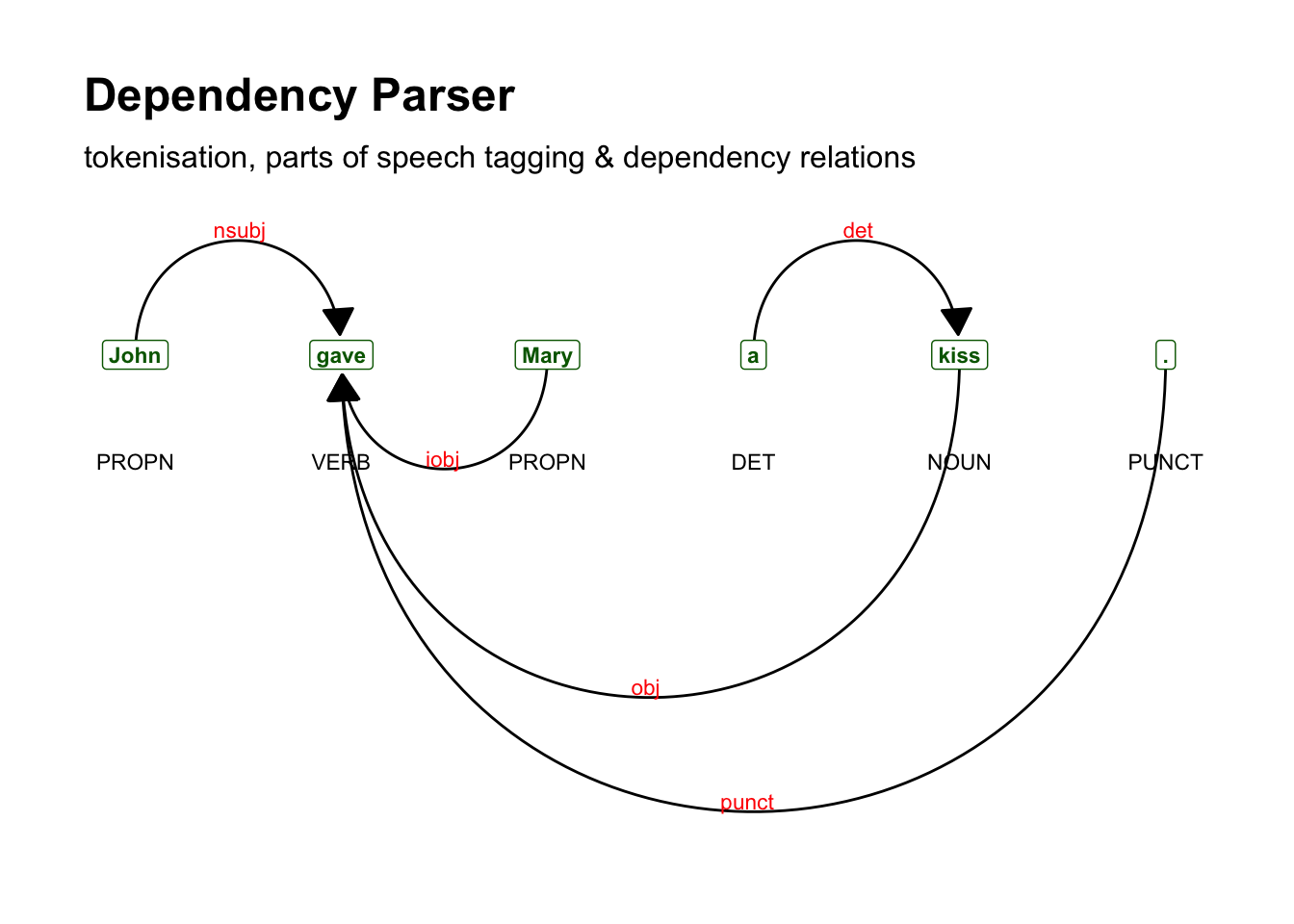 To achieve this, we first construct an object containing a sentence (in this instance, the sentence John gave Mary a kiss), and subsequently, we utilise the textplot_dependencyparser function to plot or visualise the dependencies.