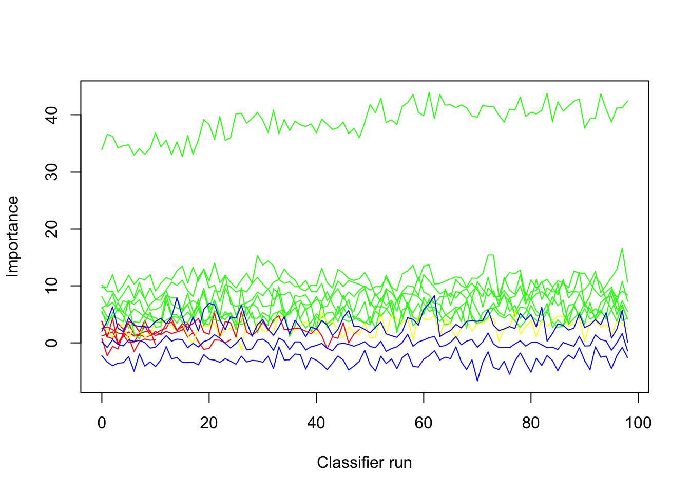 The fluctuations are do not show clear upward or downward trends (which what we want). If predictors do perform worse than the shadow variables, then these variables should be excluded and the Boruta analysis should be re-run on the data set that does no longer contain the superfluous variables. Tentative variables can remain but they are unlikely to have any substantial effect. We thus continue by removing variables that were confirmed as being unimportant, then setting a new seed, re-running the Boruta on the reduced data set, and again inspecting the decisions.