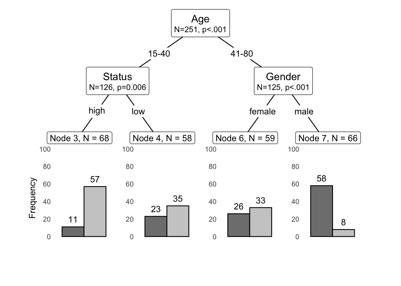 Below is an example of a decision tree which shows what what response to expect - in this case whether a speaker uses discourse like or not. Decision trees, like all CARTs and CITs, answer a simple question, namely How do we best classify elements based on the given predictors?. The answer that decision trees provide is the classification of the elements based on the levels of the predictors. In simple decision trees, all predictors, even those that are not significant are included in the decision tree. The decision tree shows that the best (or most important) predictor for the use of discourse like is age as it is the highest node. Among young speakers, those with high status use like more compared with speakers of lower social status. Among old speakers, women use discourse like more than men.