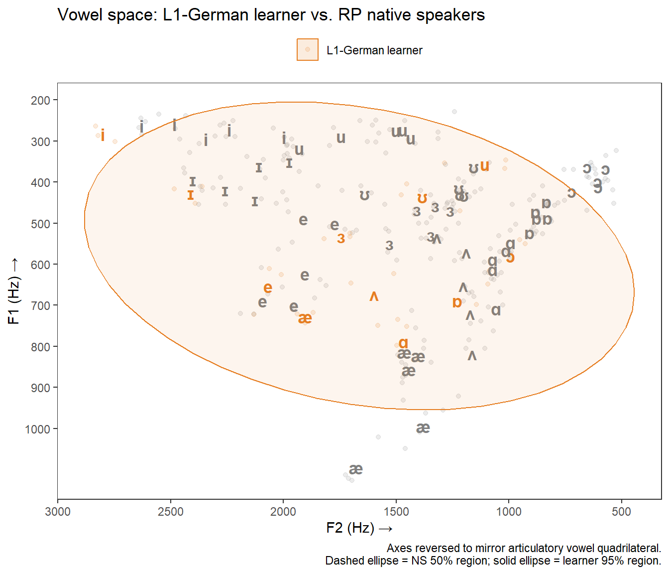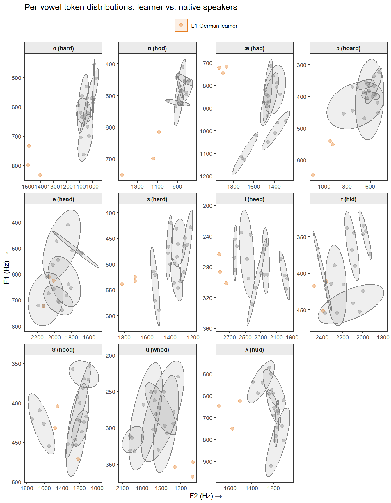 - **Overall vowel space size:** The learner's ellipses tend to be larger than the native-speaker 50% ellipses, indicating more within-category variability — a common feature of L2 production.