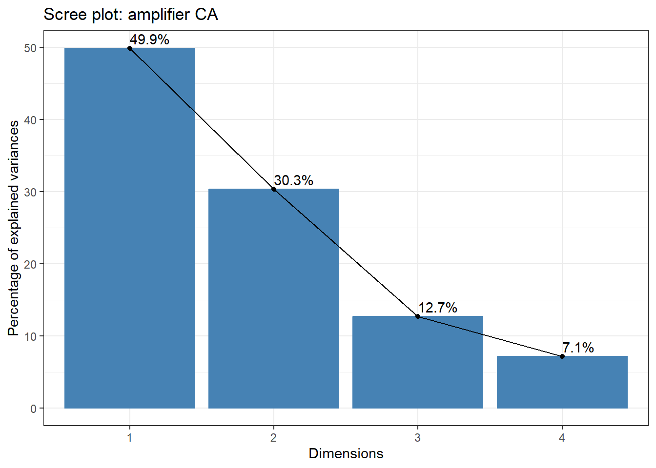 Step 6 — Correspondence analysis (if you have a contingency table) Run chi-squared first. Interpret eigenvalues and scree plot. Produce biplot with row/column contributions. Interpret each dimension as an association gradient.