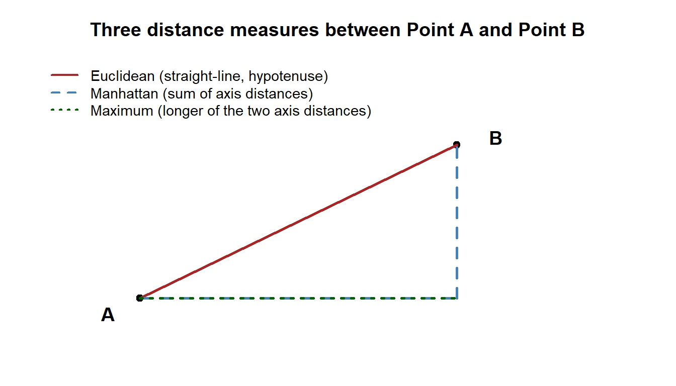 Manhattan distance (city-block, taxicab) is the sum of absolute differences along each dimension — as if you could only travel along the grid axes. It is more robust to outliers than Euclidean distance and is often preferred for linguistic data (Kassambara 2017):