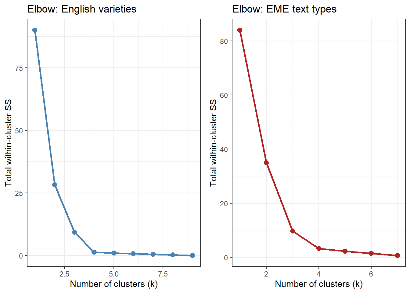 The tutorial is aimed at intermediate users of R. It showcases how to perform and visualise the results of hierarchical cluster analysis, k-means clustering, and correspondence analysis, and how to validate and interpret the results. The aim is not to provide an exhaustive theoretical treatment but to give practical guidance grounded in linguistic examples. For deeper theoretical coverage, see Kassambara (2017) (highly recommended), King (2015), Kettenring (2006), Romesburg (2004), and Blashfield and Aldenderfer (1988).