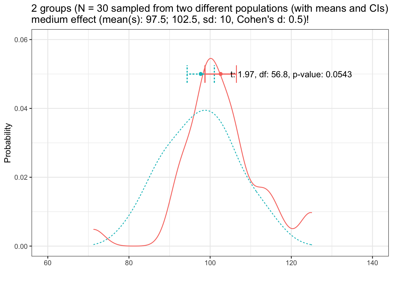 Based on the t-test results in the distribution plot, we assume that the data represents two samples from the same population (which is false) because the p-value is higher than .05. This means that the sample size is insufficient or does not enough power to show that they are actually from two different populations given the variability in the data nd the size of the effect (which is weak).