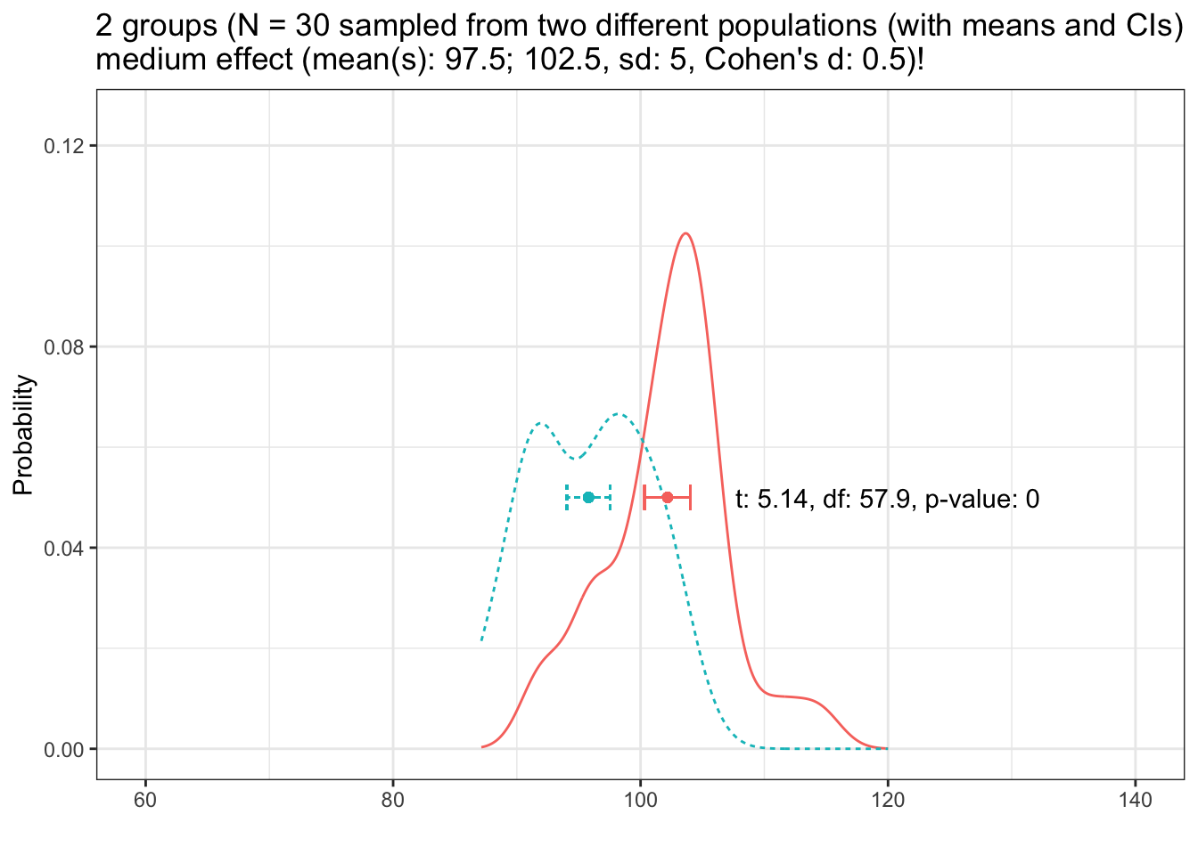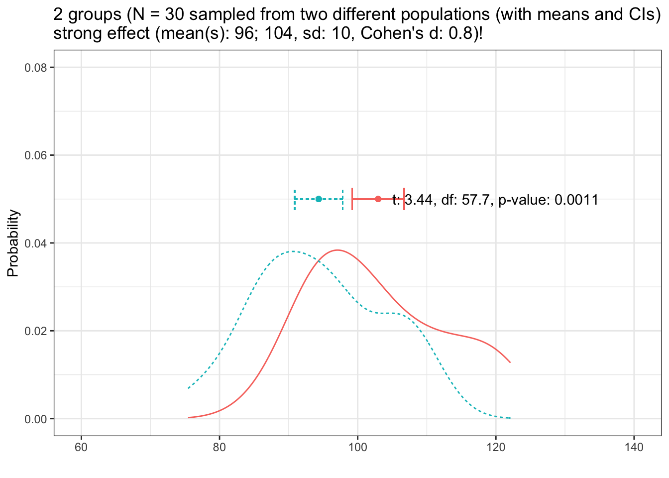 Let us now draw another two samples (N = 30) but from different populations where the effect of group is weak (the population difference is small).