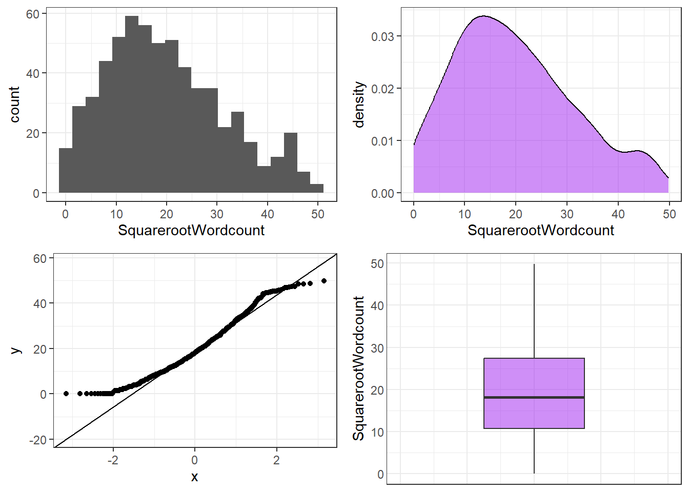 | Moderately right-skewed | Square root | sqrt(x) |