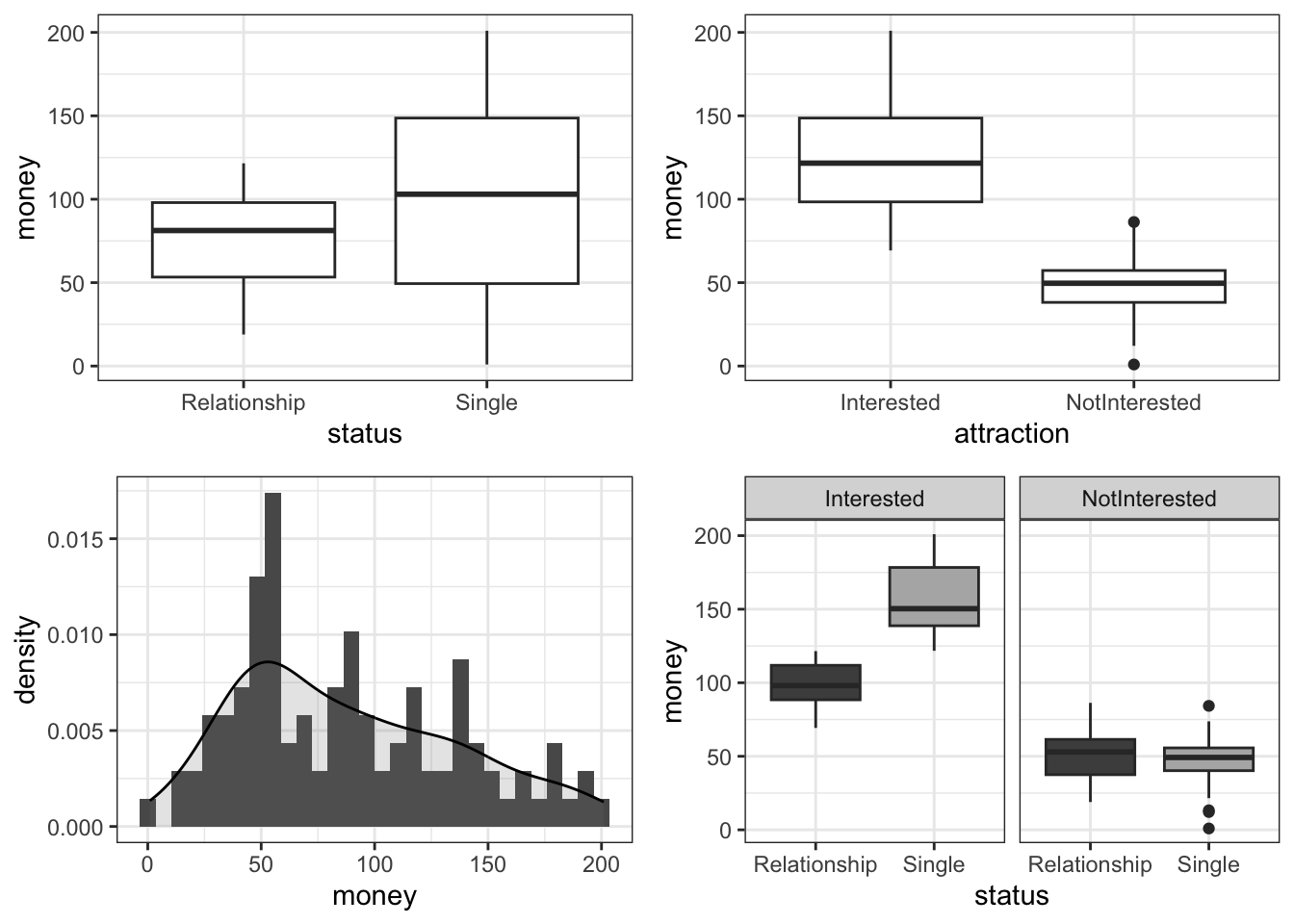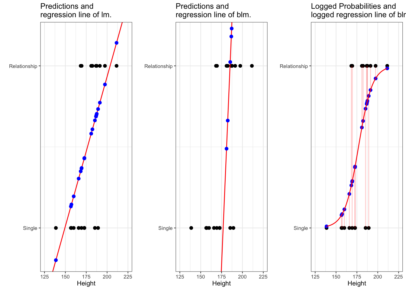 Some words about the plots in the figure above: the upper left panel shows the raw observed data (black dots). The upper right panel shows the mean weight (blue line) and the residuals (in red). residuals are the distances from the expected or predicted values to the observed values (in this case the mean is the most most basic model which we use to predict values while the observed values simply represent the actual data points). The lower left panel shows observed values and the regression line, i.e, that line which, when drawn through the data points, will have the lowest sum of residuals. The lower right panel shows the regression line and the residuals, i.e. the distances between the expected or predicted values to the actual observed values (in red). Note that the sum of residuals in the lower right panel is much smaller than the sum of residuals in the upper right panel. This suggest that considering Height is a good idea as it explains a substantive amount of residual error and reduces the sum of residuals (or variance).2