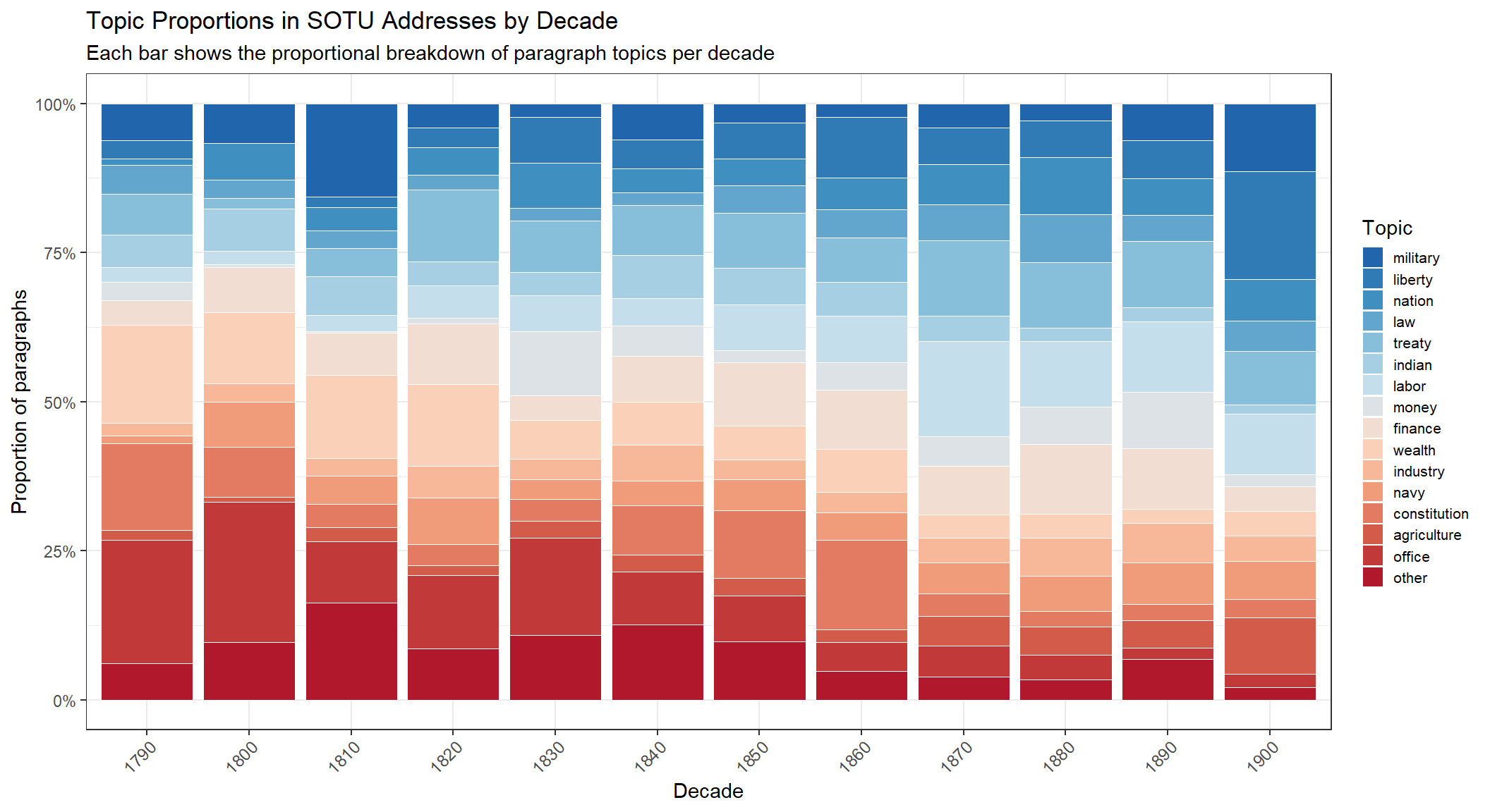 The final visualisation shows how topic prevalence has shifted across decades of SOTU addresses: