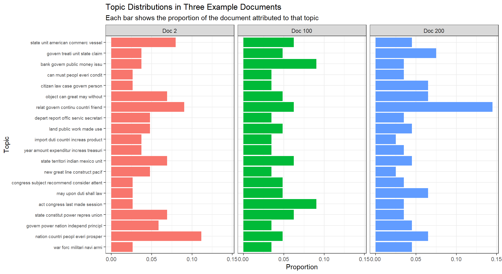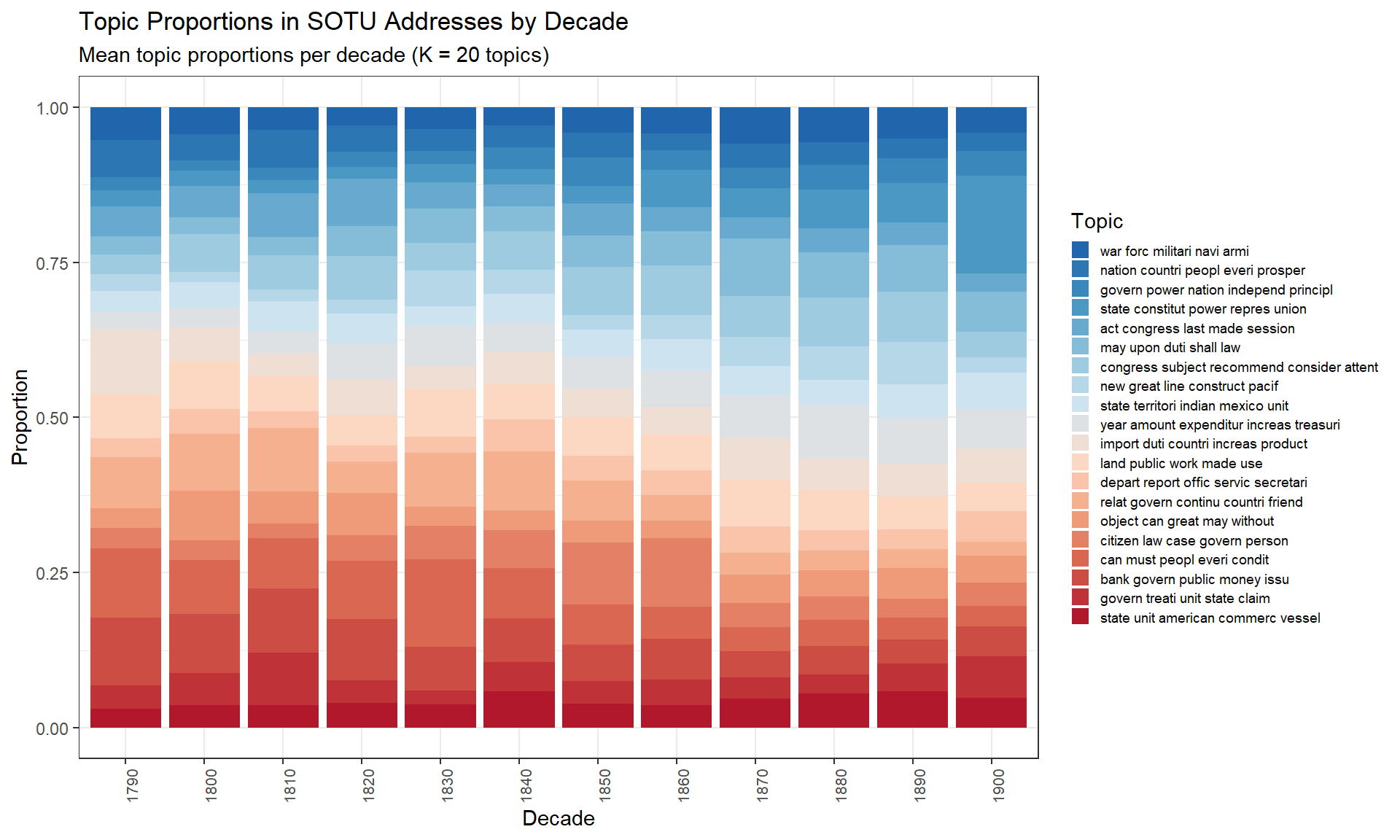 The visualisation confirms historical patterns visible in the SOTU record: topics relating to constitutional structure and state–federal relations dominate early decades; economic and fiscal topics grow through the 19th century; security and international affairs topics become more prominent from the 20th century onwards.