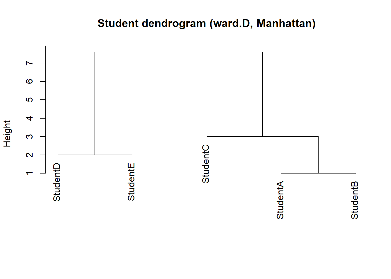 Manhattan distance (city-block, taxicab) is the sum of absolute differences along each dimension — as if you could only travel along the grid axes. It is more robust to outliers than Euclidean distance and is often preferred for linguistic data (Kassambara 2017):