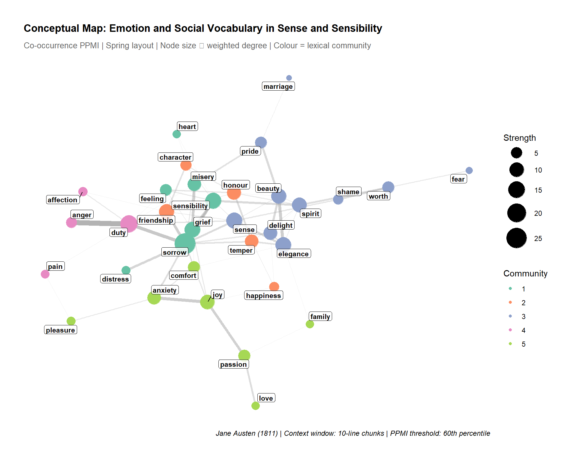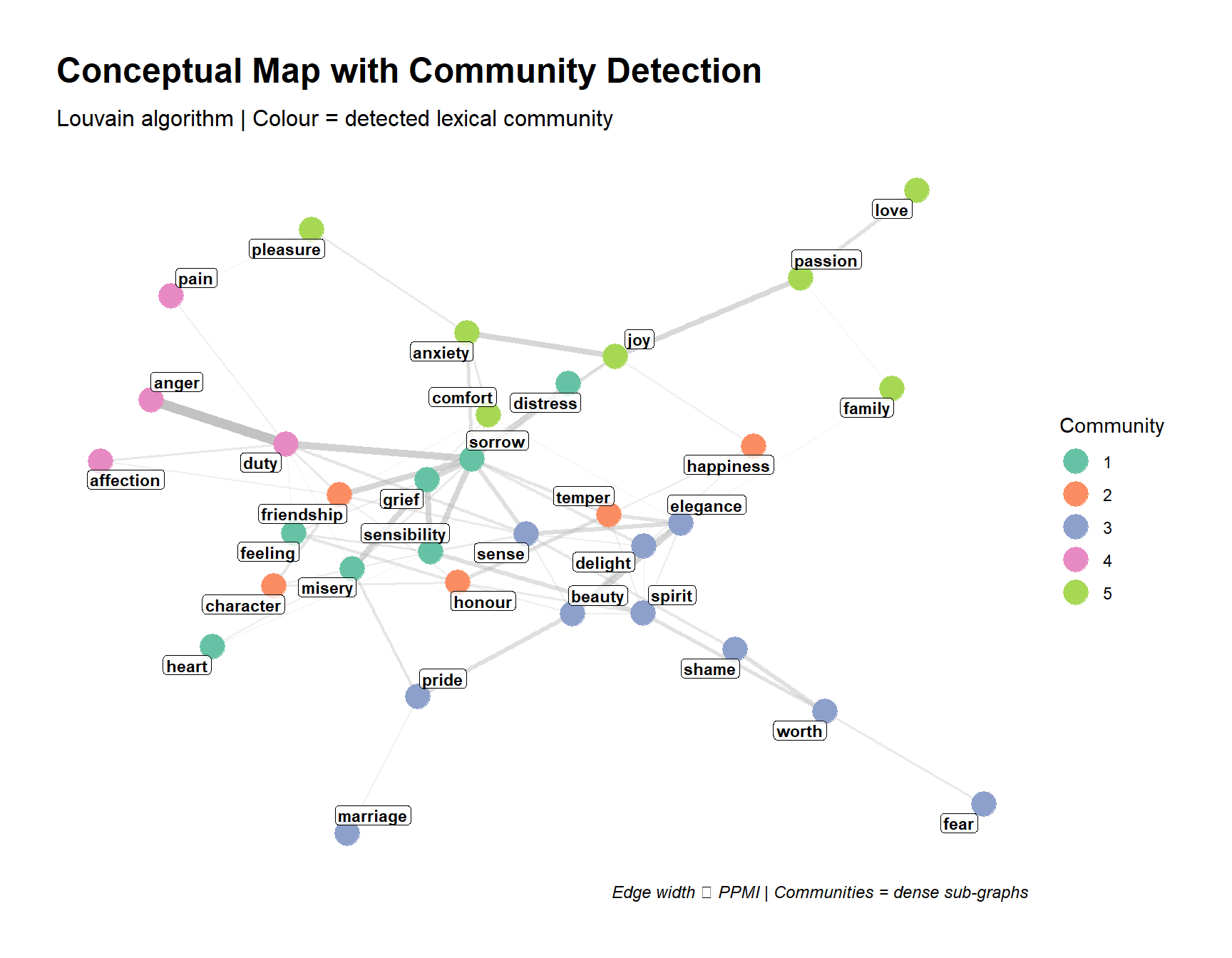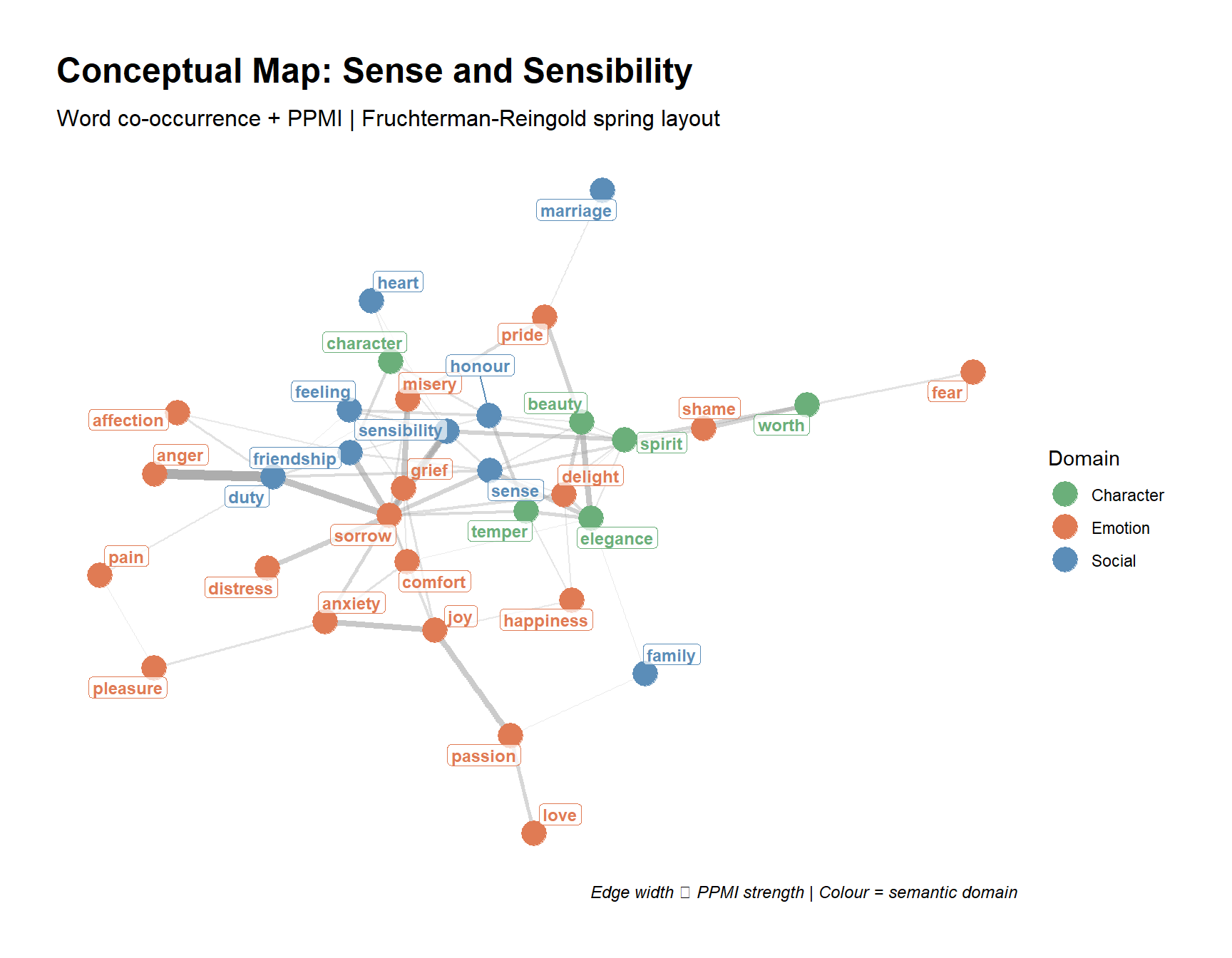 This tutorial introduces conceptual maps — a family of visualisation techniques that represent semantic relationships between words or concepts as a spatial network, where proximity encodes similarity. Conceptual maps have become an increasingly popular tool in corpus linguistics, cognitive linguistics, and digital humanities for exploring how words cluster into meaning domains, how concepts relate across registers or time periods, and how semantic structure can be revealed from large bodies of text (Schneider 2024).