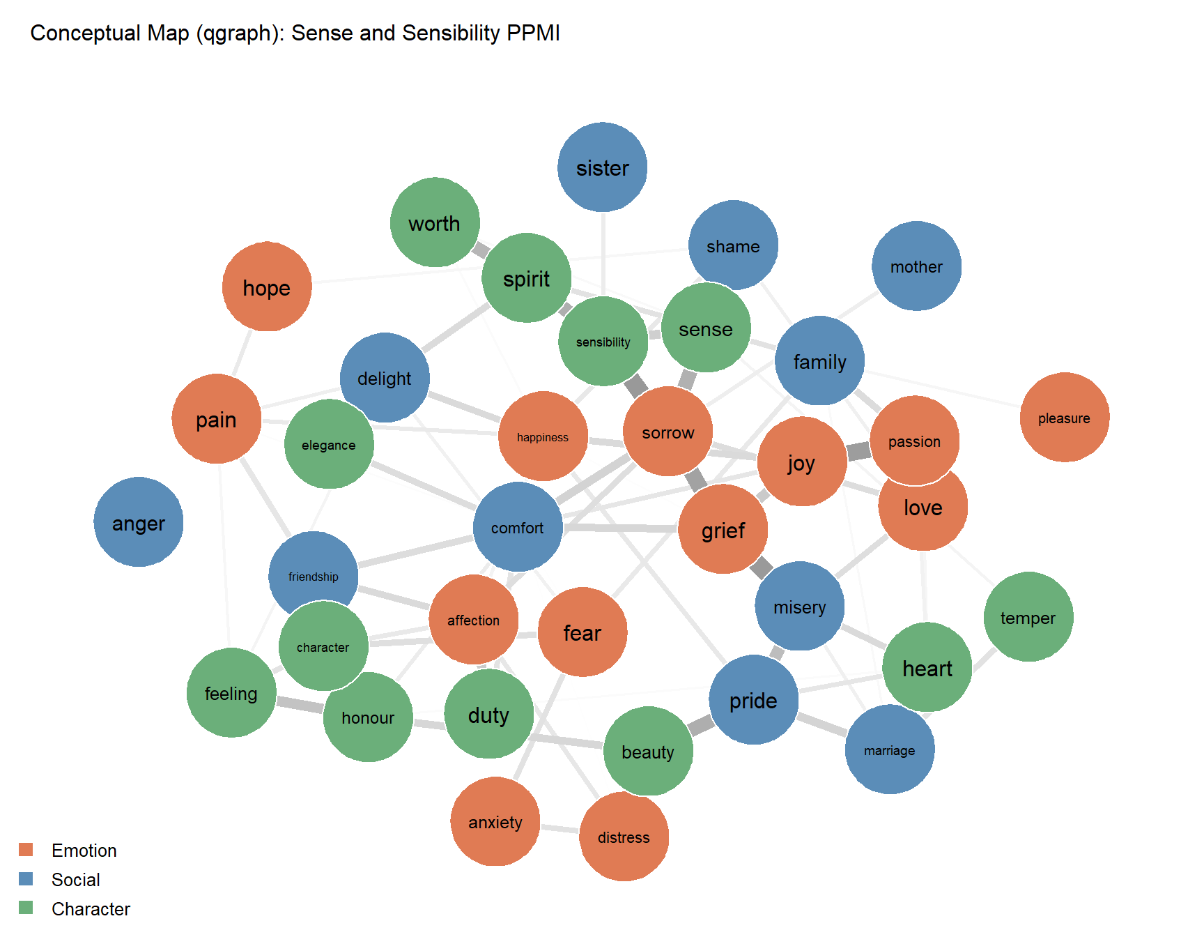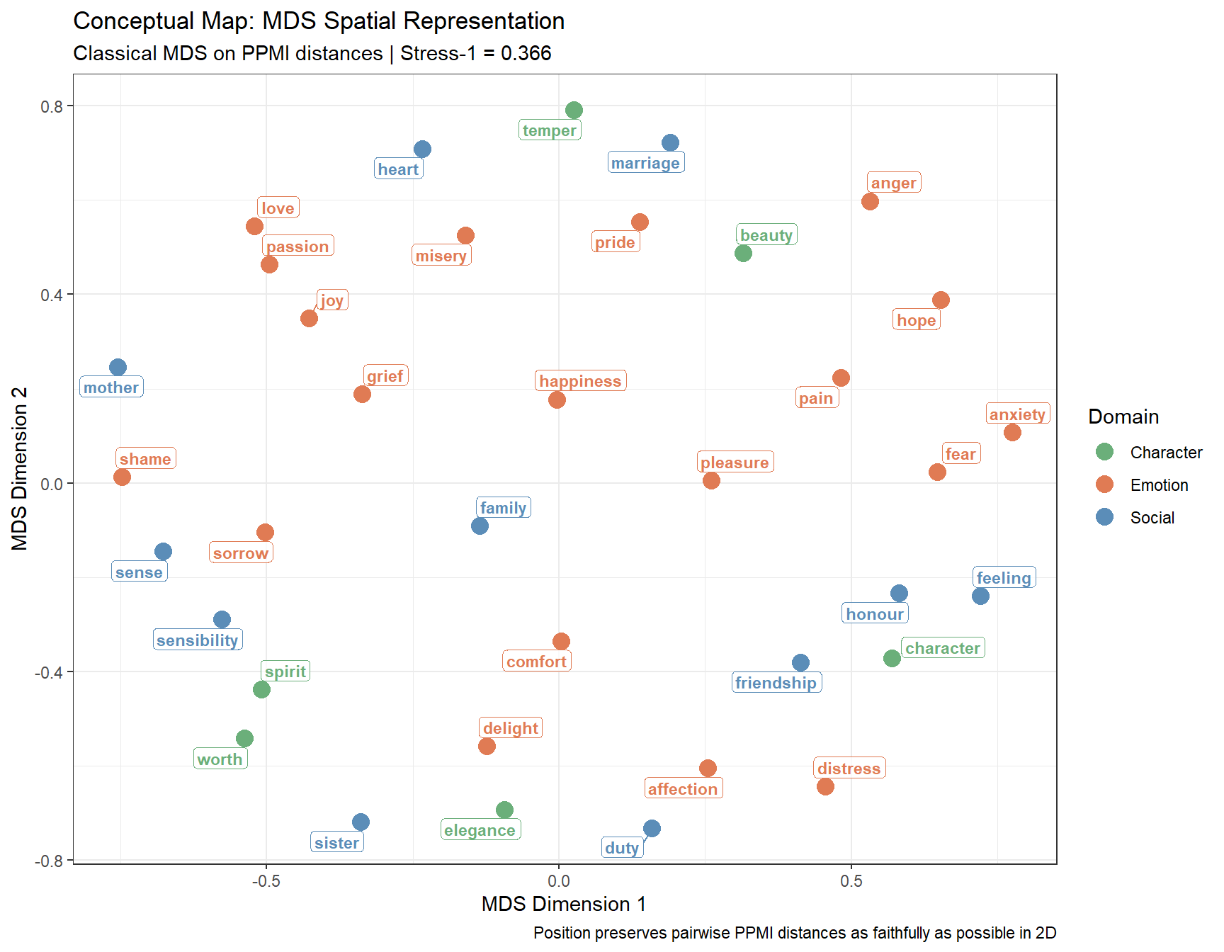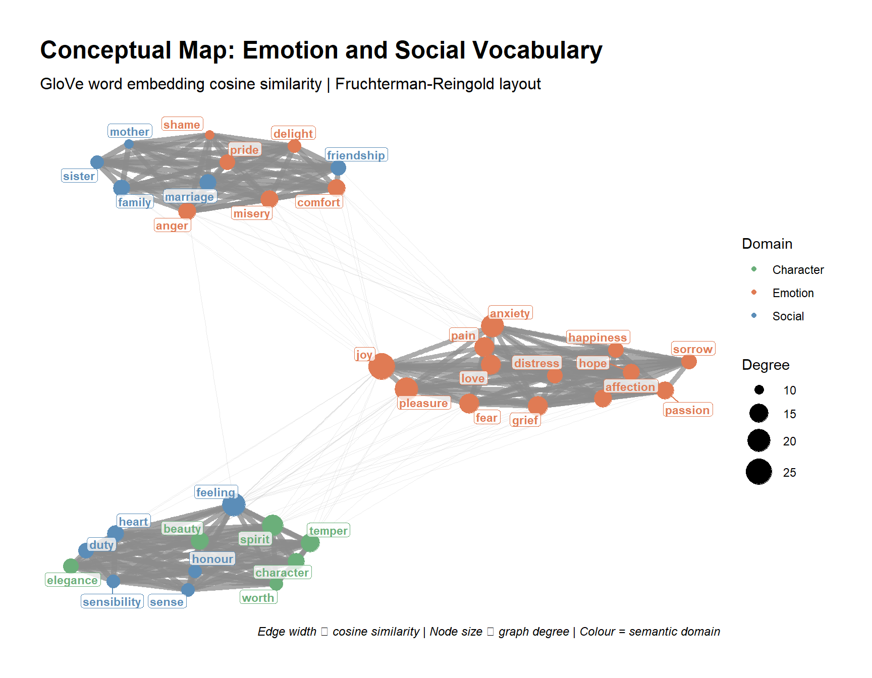This tutorial introduces conceptual maps — a family of visualisation techniques that represent semantic relationships between words or concepts as a spatial network, where proximity encodes similarity. Conceptual maps have become an increasingly popular tool in corpus linguistics, cognitive linguistics, and digital humanities for exploring how words cluster into meaning domains, how concepts relate across registers or time periods, and how semantic structure can be revealed from large bodies of text (Schneider 2024).