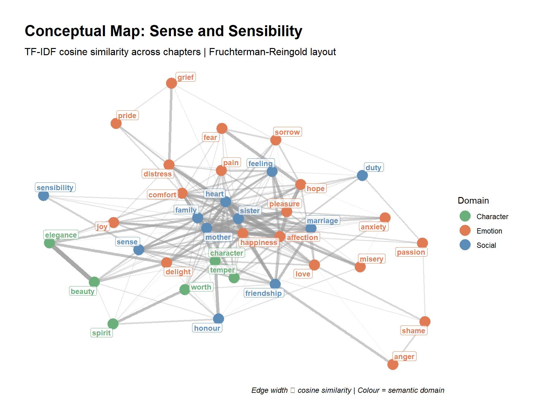 Throughout this tutorial we use Jane Austen’s Sense and Sensibility (1811), downloaded from Project Gutenberg. This novel provides a rich vocabulary of emotion, social relations, and domestic life — an ideal domain for exploring semantic clustering.