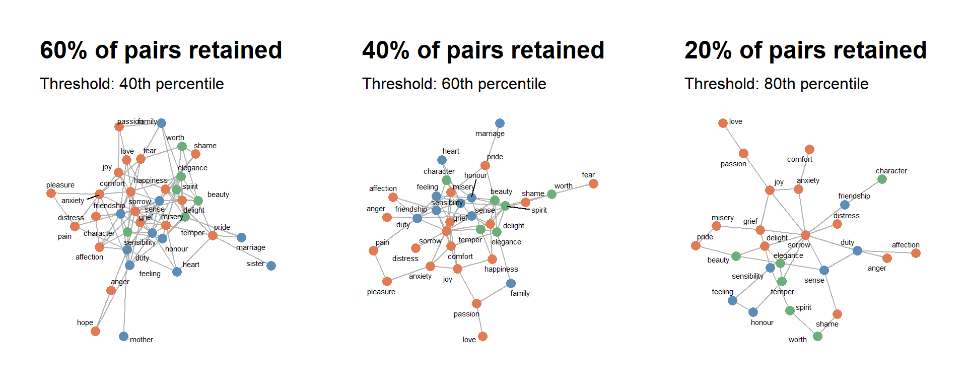 50 million tokens is more than sufficient to train stable GloVe embeddings (the rule of thumb is 1–5 million tokens minimum). Corpus-trained embeddings will capture domain-specific historical usage — how Victorian newspapers used emotion vocabulary — which pre-trained modern GloVe would miss (it reflects contemporary English usage). Running both a PPMI co-occurrence map (local collocation patterns) and an embedding map (broader distributional semantics) allows comparison and cross-validation of clusters. ggraph with a community detection overlay is well-suited to 60 nodes. MDS is a useful complement but not a replacement; option (a) is overly restrictive; option (b) is incorrect about the corpus size threshold.