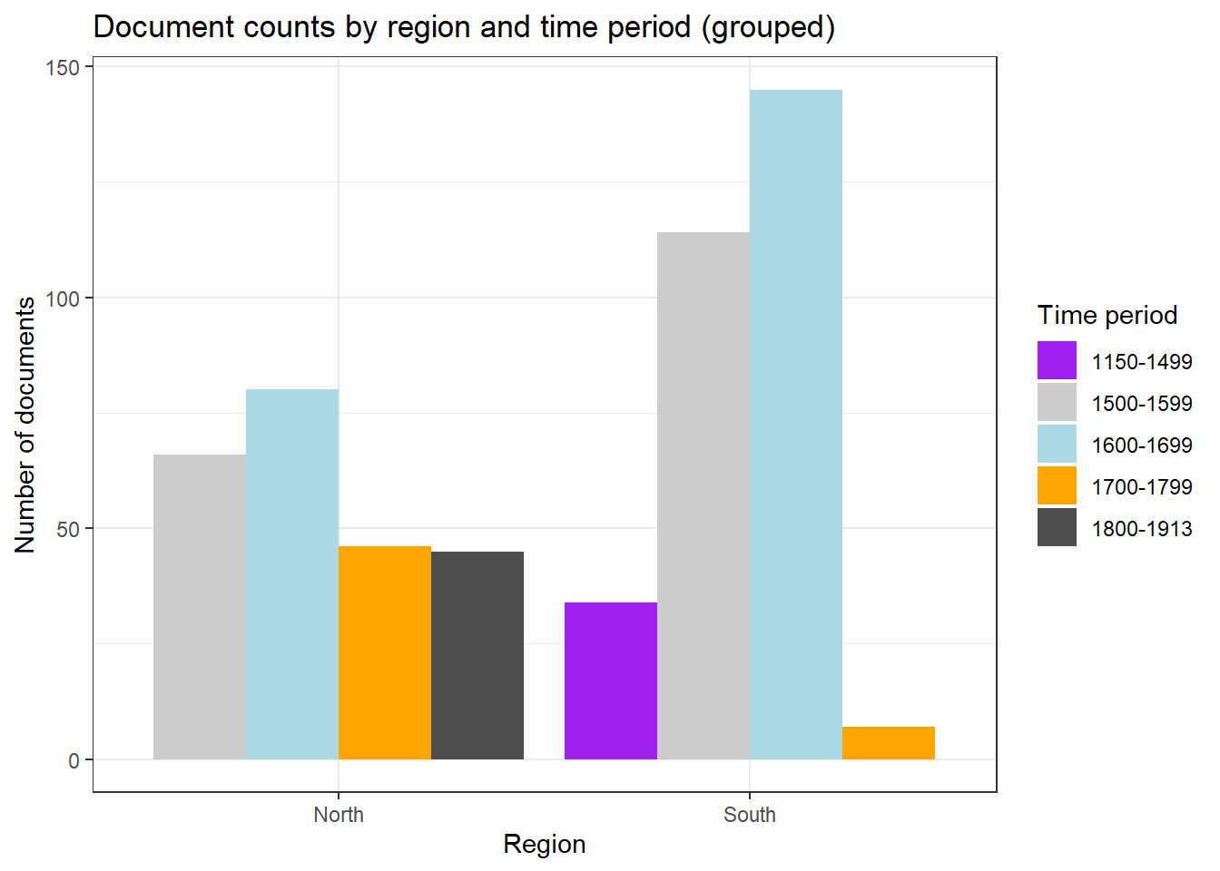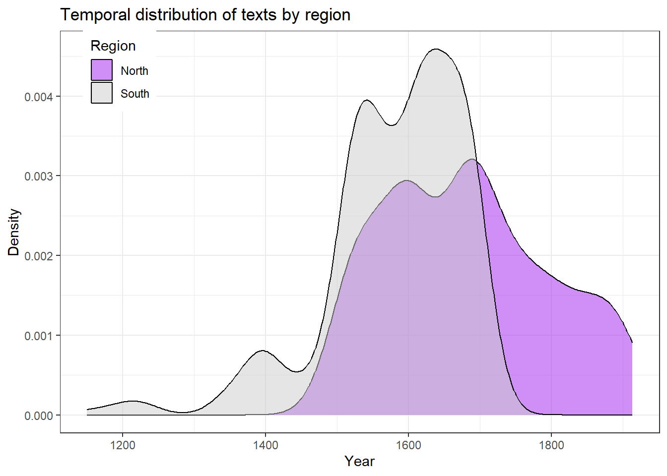 The plot shows that southern texts continue into the 1800s while northern texts end around 1700, with a period of overlap in between.
