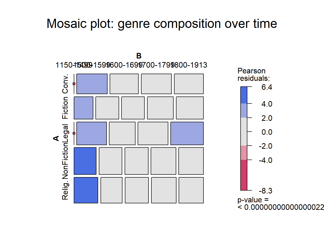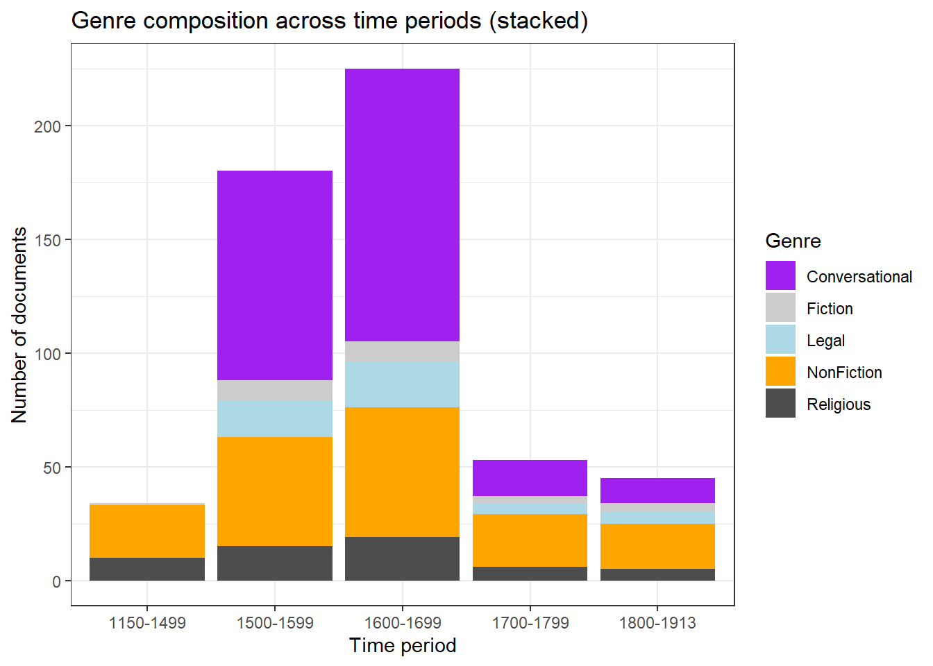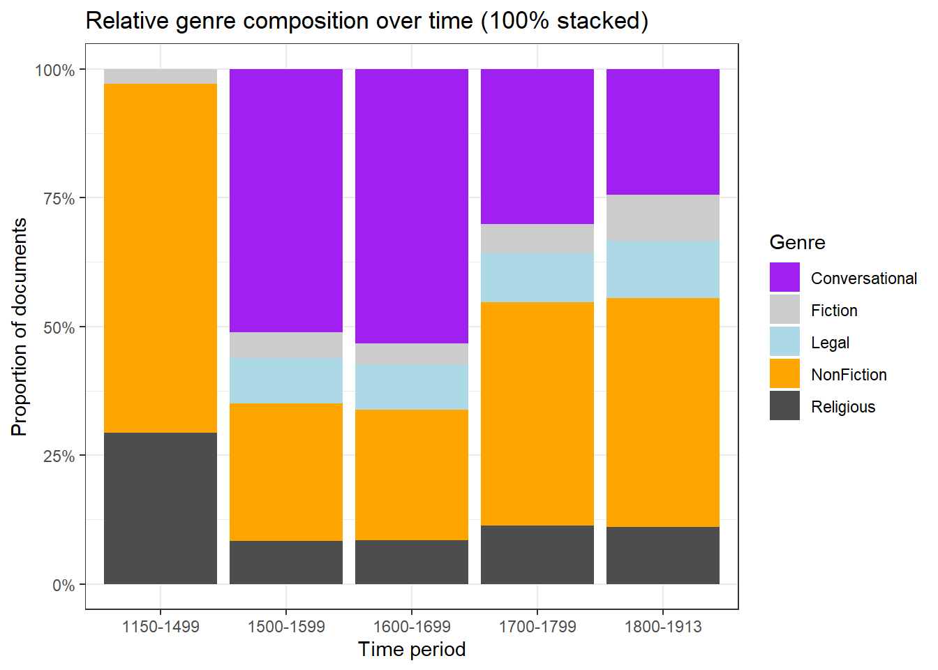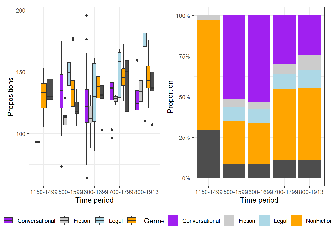 pa <-ggplot(pdat, aes(DateRedux, Prepositions, fill = GenreRedux)) +geom_boxplot() +scale_fill_manual(values = clrs) +theme_bw() +labs(x ="Time period", y ="Prepositions", fill ="Genre")pb <-ggplot(pdat, aes(DateRedux, fill = GenreRedux)) +geom_bar(position ="fill") +scale_fill_manual(values = clrs) +scale_y_continuous(labels = scales::percent) +theme_bw() +labs(x ="Time period", y ="Proportion", fill ="Genre")pa2 <- pa +theme(legend.position ="bottom")pb2 <- pb +theme(legend.position ="bottom")pa2 | pb2