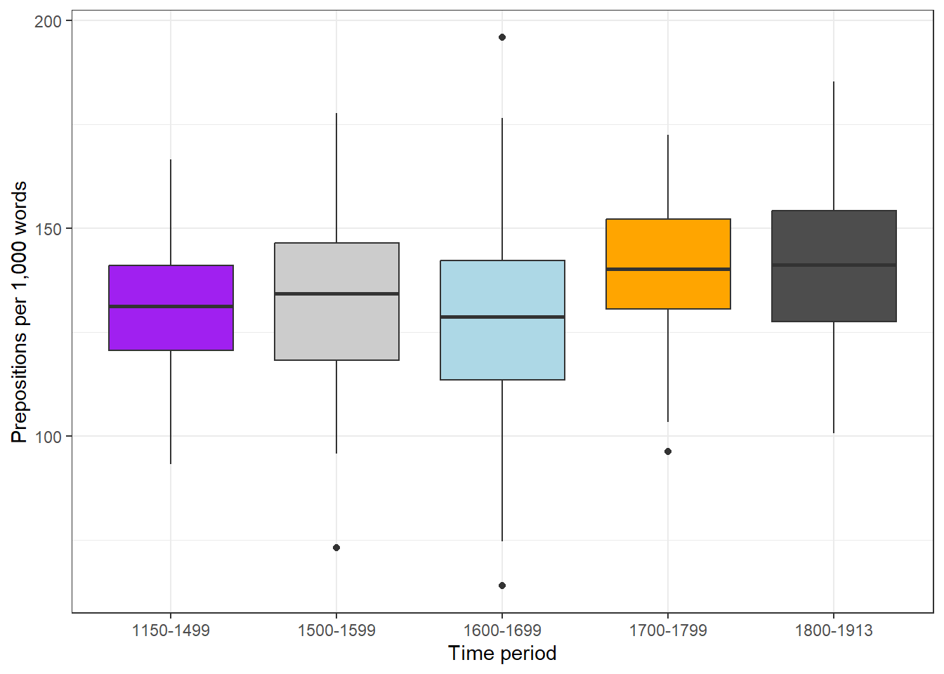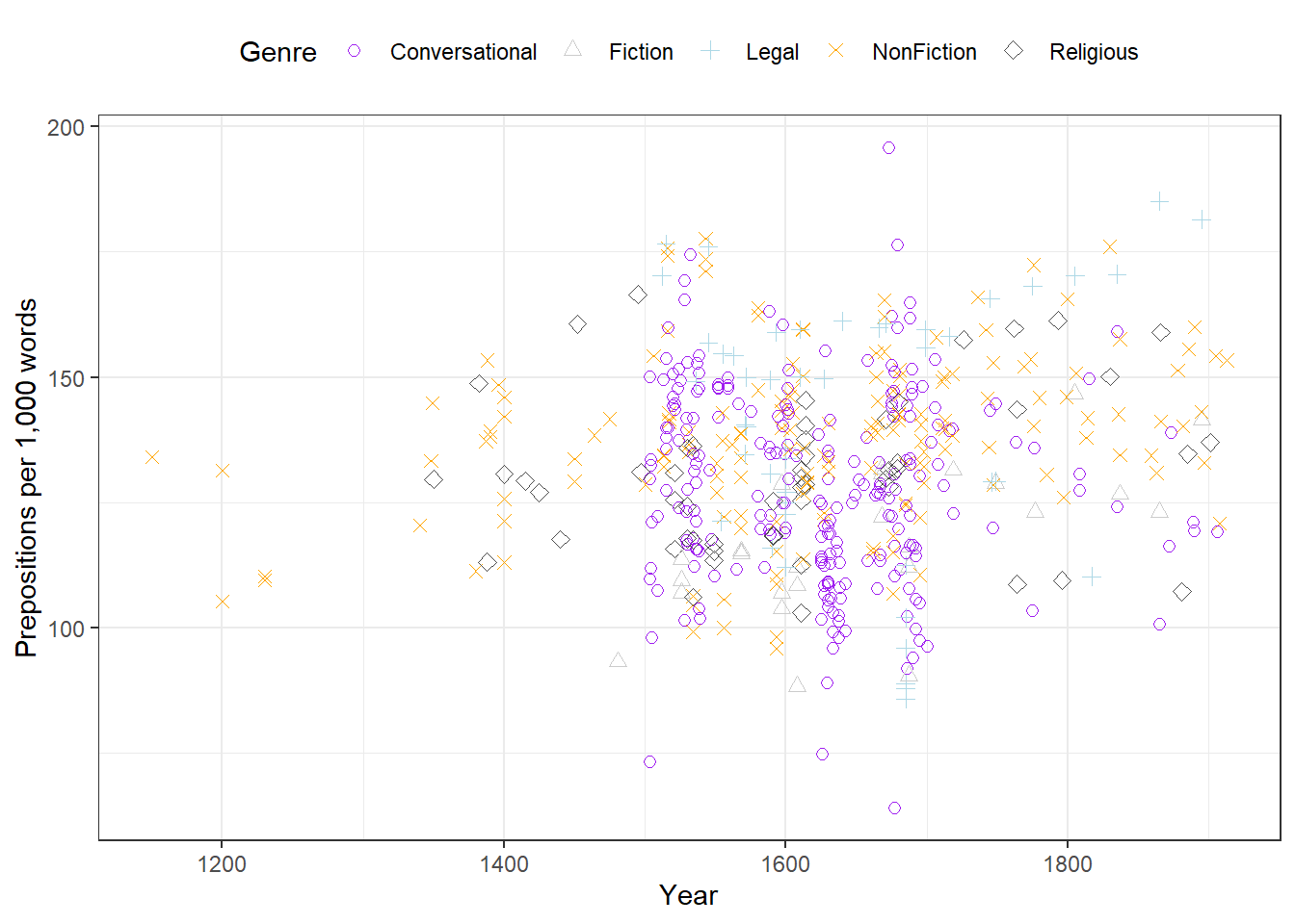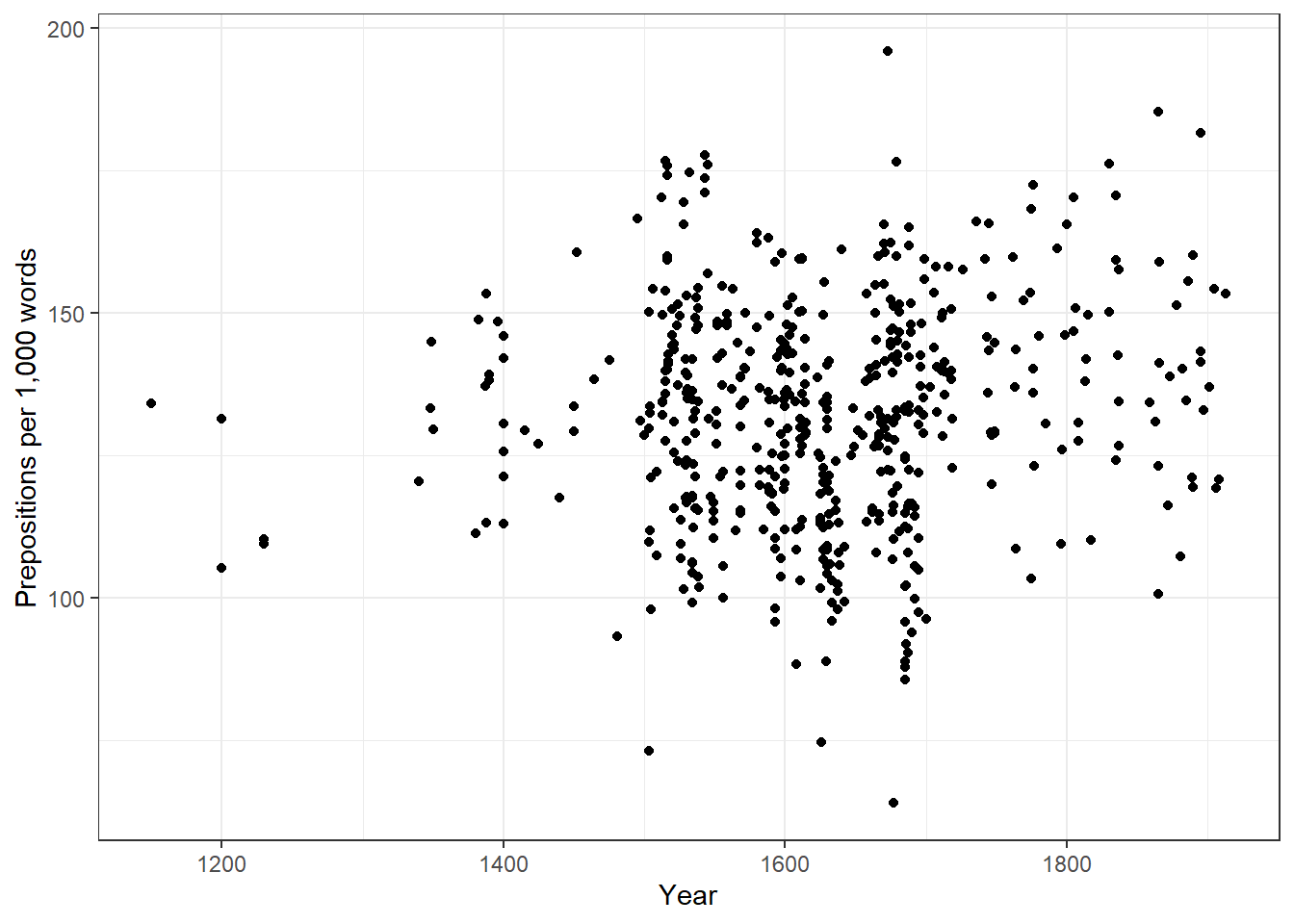 We work throughout this tutorial with a dataset on preposition frequencies in historical English texts from the Penn Parsed Corpora of Historical English (PPCME, PPCEME, PPCMBE). Each row represents one text, and the key variables are described below.