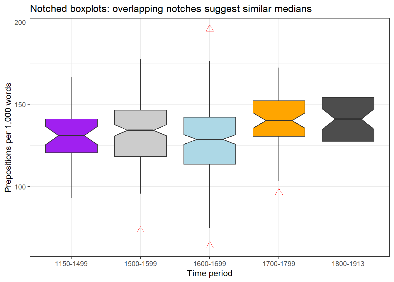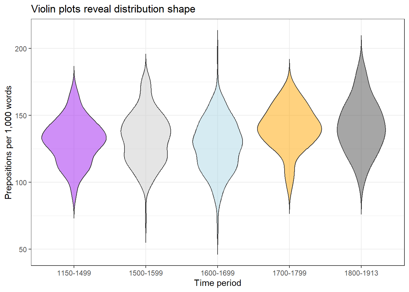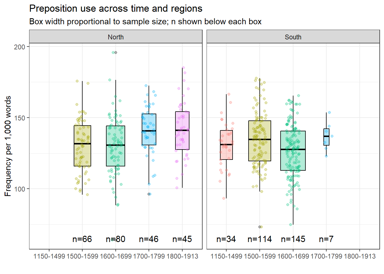 We work throughout this tutorial with a dataset on preposition frequencies in historical English texts from the Penn Parsed Corpora of Historical English (PPCME, PPCEME, PPCMBE). Each row represents one text, and the key variables are described below.